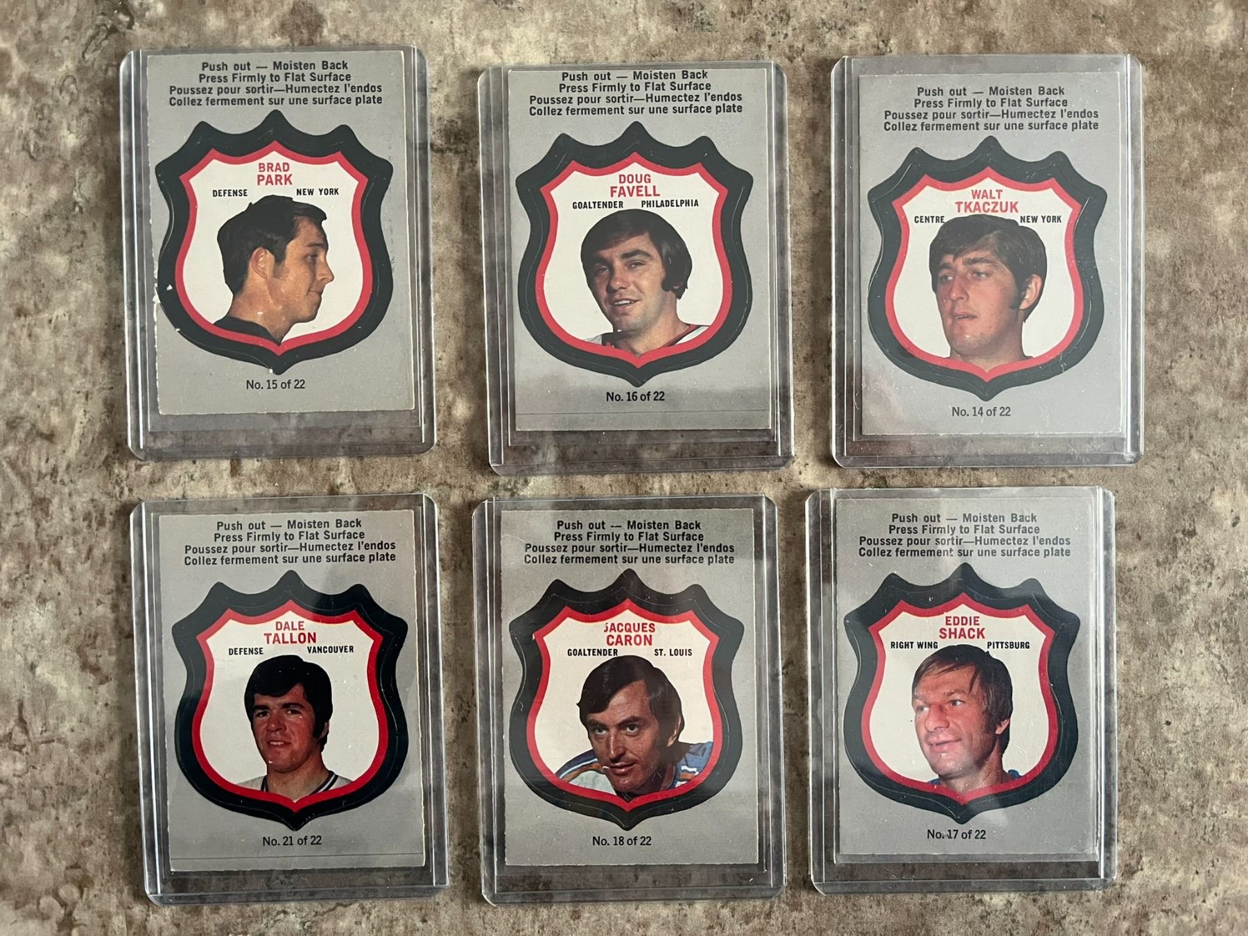 1972 1973 OPC Hockey card lot of 6 player crests from 1st series wax packs. Excellent condition. Shack, Favell, Park, Tallon, Tkaczuk, Caron.