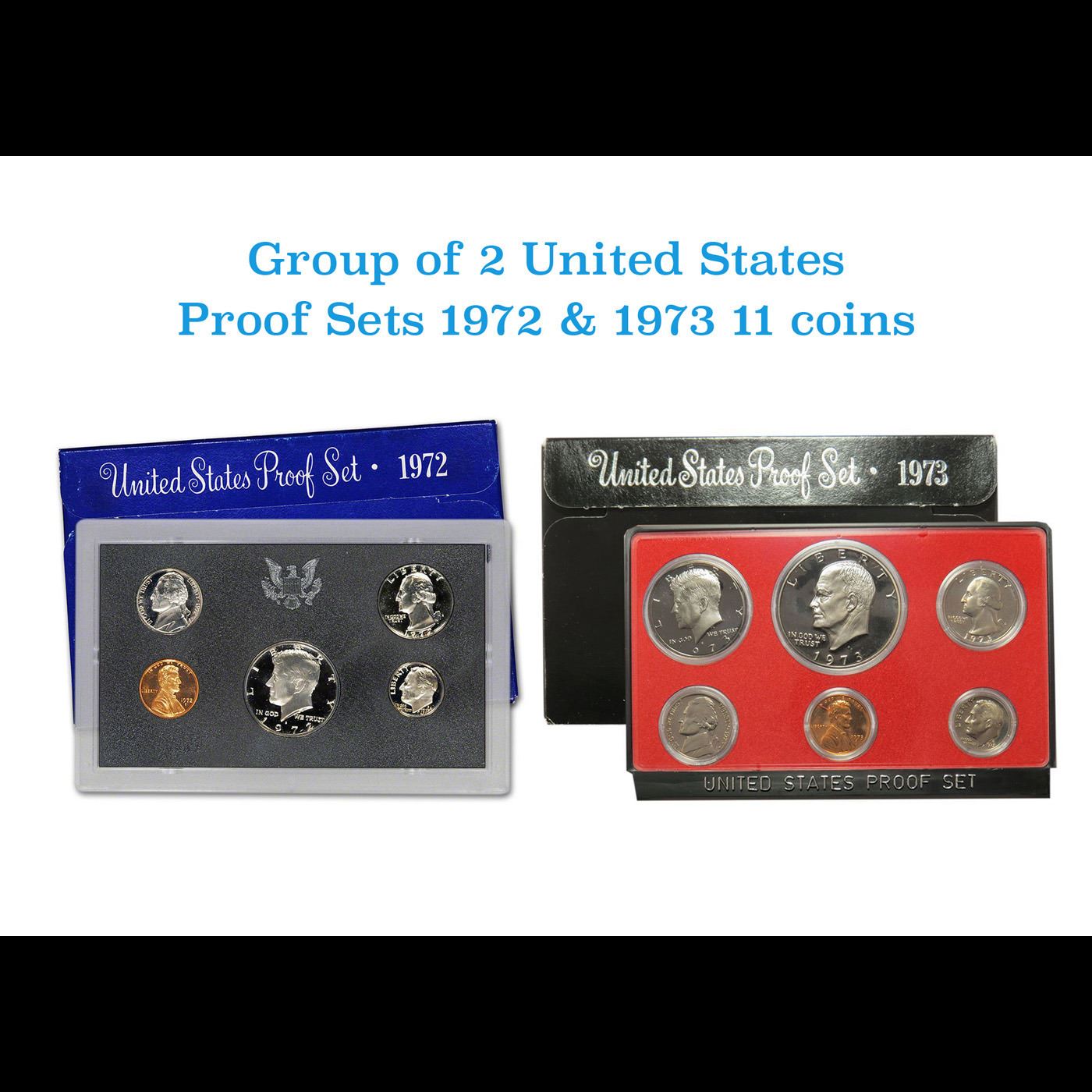 1972 & 1973 United Stated Mint Proof Set In Original Government Packaging. The 1972 Proof Sets Includes 5 Cameo Proof Coins, the original Mint Packaging. The 1973 Proof Set Includes 6 Proof Coins Including the Eisenhower Proof Dollar.