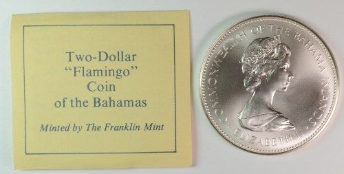 1972 $2.00 BAHAMAS FLAMINGO SILVER Pf. COIN, WITH COA, ONE TROY OZ .999 SILVER