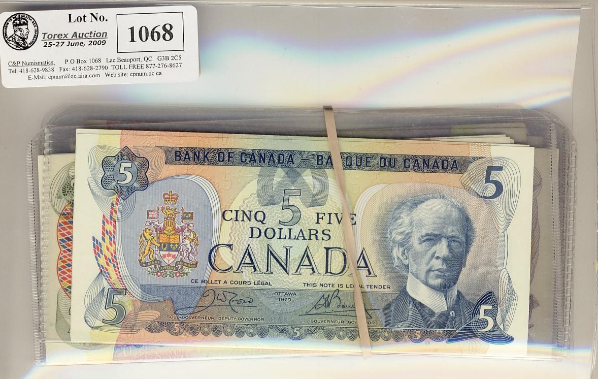 1972 $5-1979 $20. Lot of Multi colour banknotes, includes 1972 $5 BC-48a, BC-48b, 1971 $10 BC49a (2), BC-49b, 1969 $20 BC-50a (4), 1975 $50 BC-51a (3), 1975 $100 BC-52b (2), BC-52a, 1979 $5 BC-53b and 1979 $20 BC-54a (4). 21 notes in all. $650 face valu