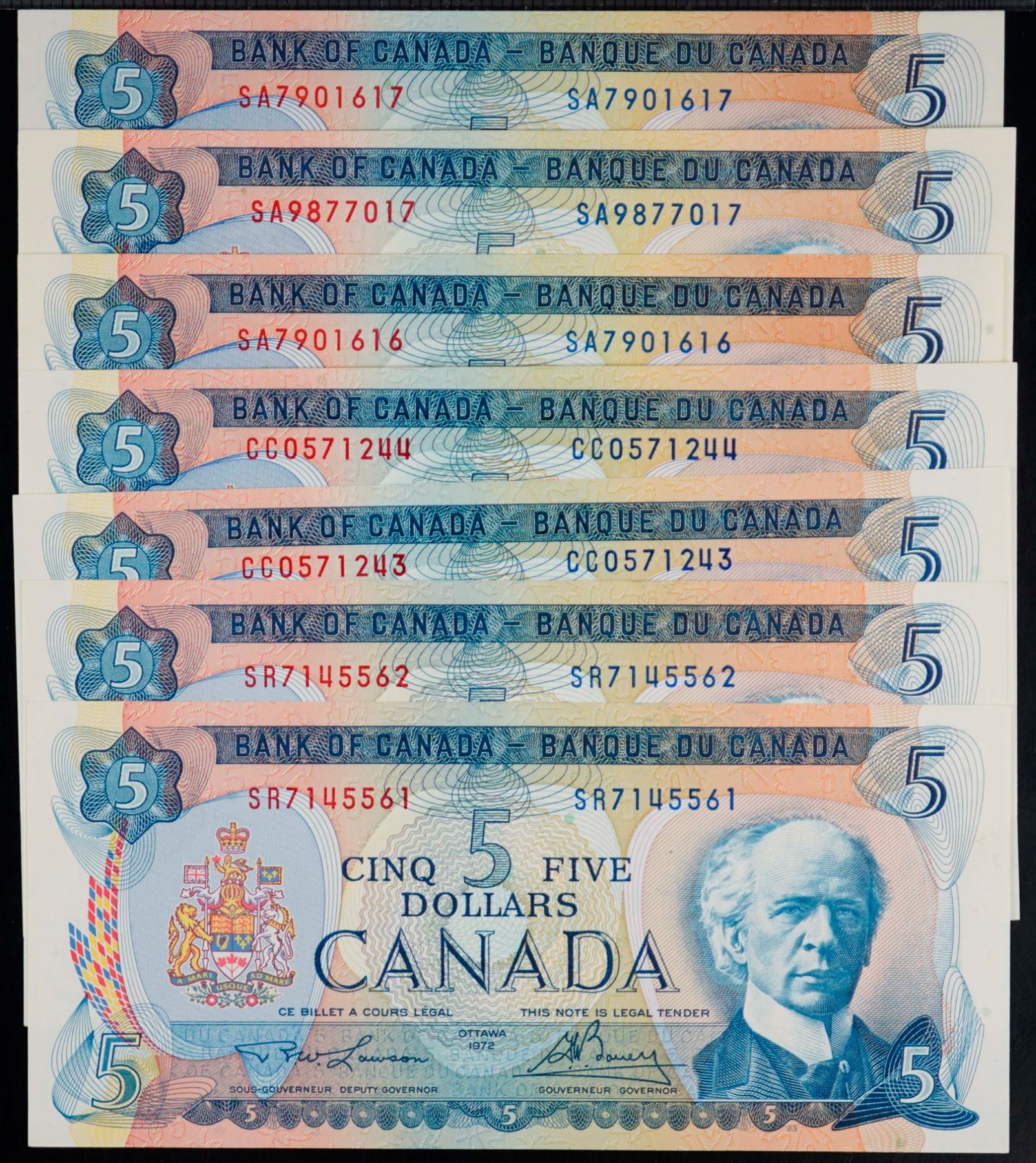 1972 $5 BC-48a & 48b includes consecutive pairs. 8 notes in Uncirculated or better.