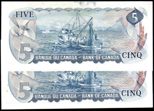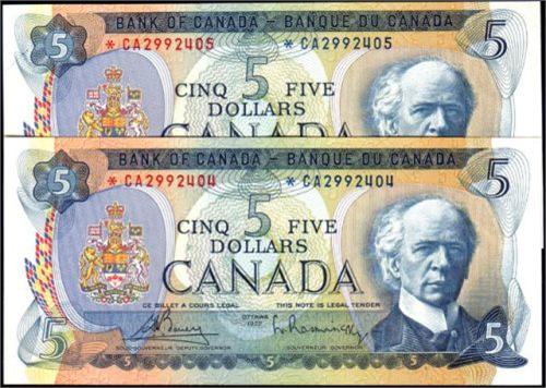 1972 Five Dollars Bouey-Rasminsky, BC-48aA, two consecutive serial numbers *CA2992404 and CA2992405, both Uncirculated