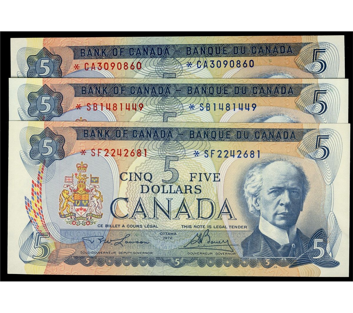 1972 $5 BC-48aA #*CA3090860, *SF1481449 & *SF2242681. Lot of 3 replacement issues. Choice UNC.