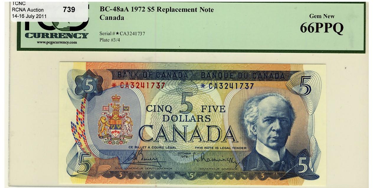 1972 $5 BC-48aA *CA3241737 PCGS UNC66PPQ, serial number closes to the changeover.