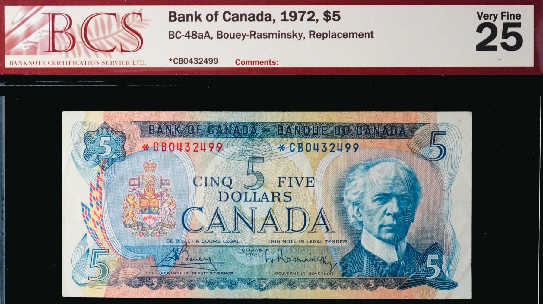 1972 $5 BC-48aA #*CB0432499 BCS Choice Very Fine-25, Excessively rare Replacement note. Less than 6 known examples. Worth a premium bid.