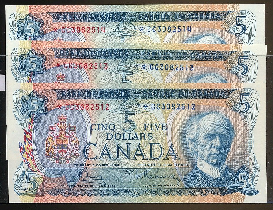 1972 $5 BC-48aA #*CC3082512-514. Lot of 3 consecutive replacement issues, Choice UNC.