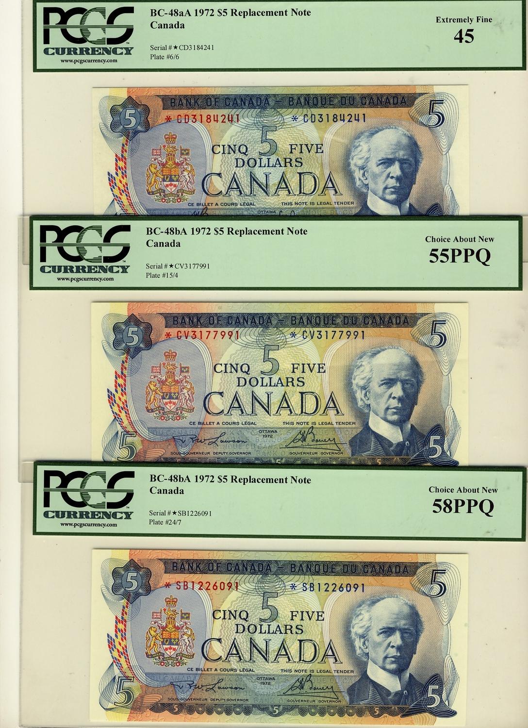 1972 $5 BC-48aA #*CD EF45, *CV AU55PPQ & *SB AU58PPQ.  Lot of 3 notes all PCGS graded, 2 with PPQ designation.