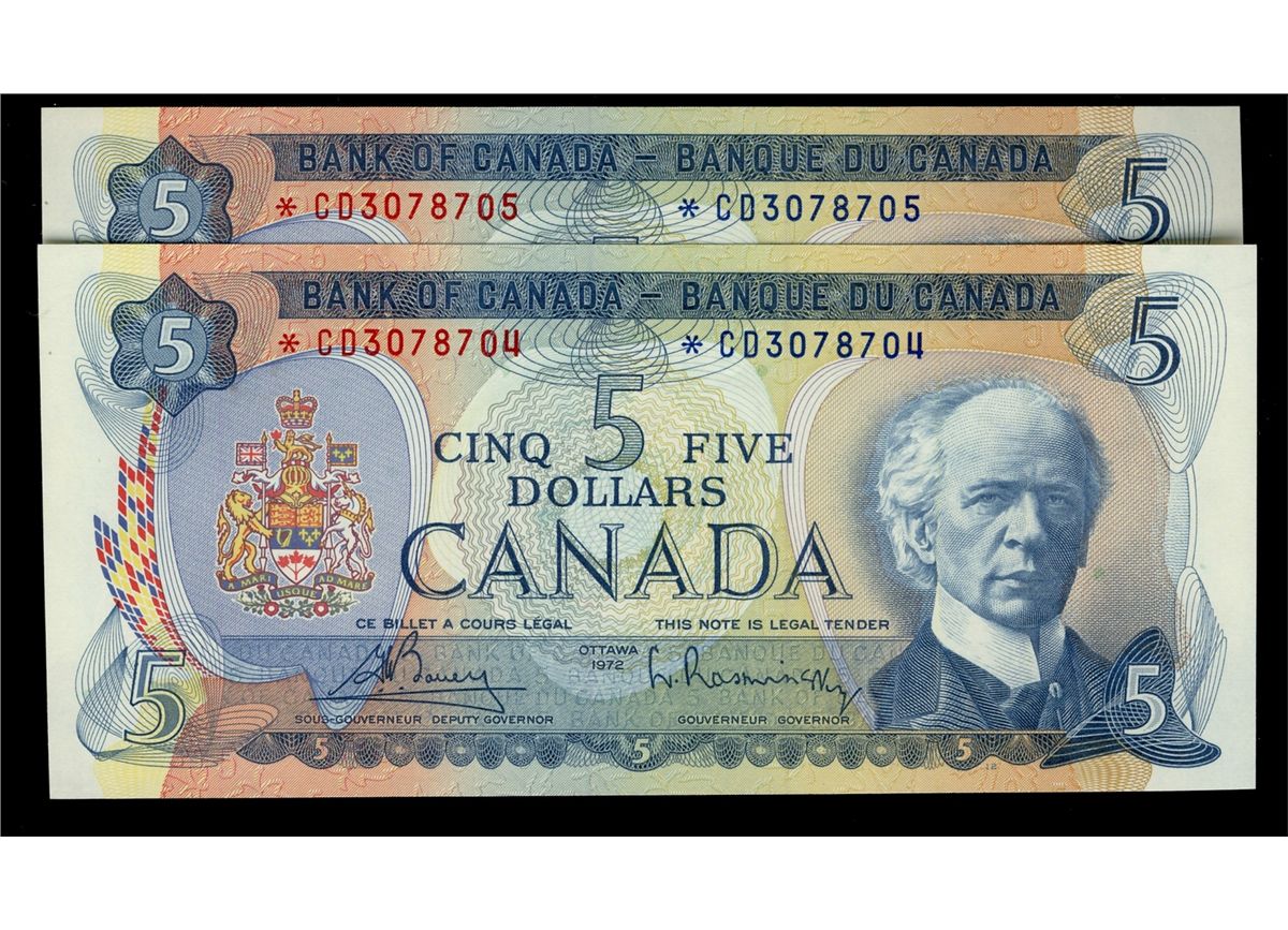 1972 $5 BC-48aA #*CD3078704-8705. Lot of 2 consecutive notes both UNC.