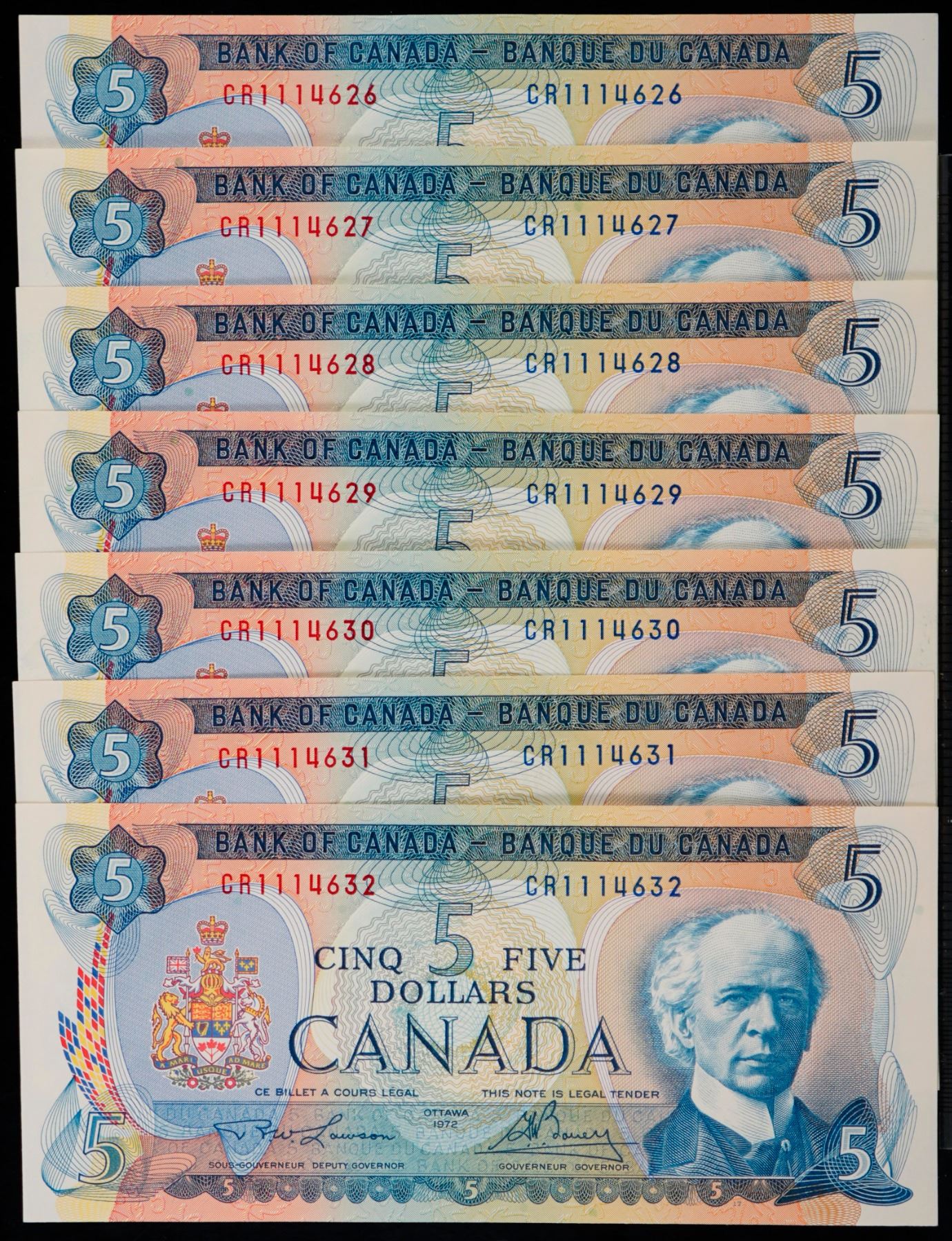 1972 $5 BC-48b #CR1114626-4632. 7 Consecutive notes in Uncirculated or better.