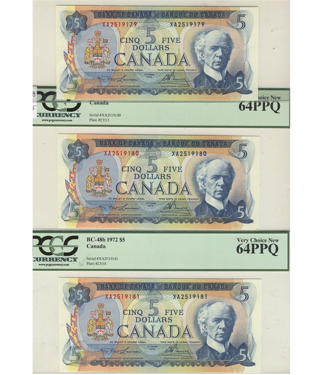 1972 $5 BC-48b #XA2519179,80,81 CH-UNC-64. 3 CONS