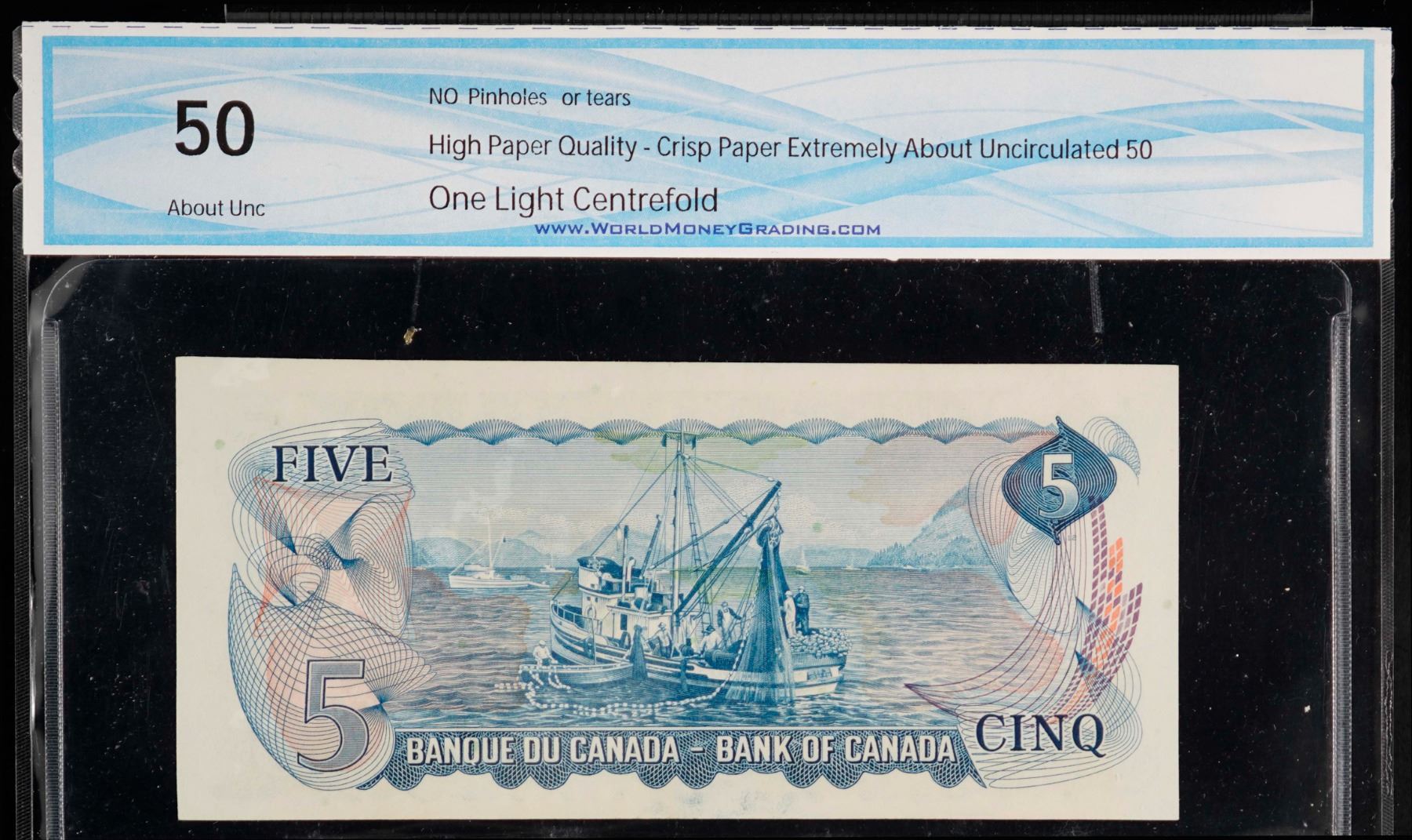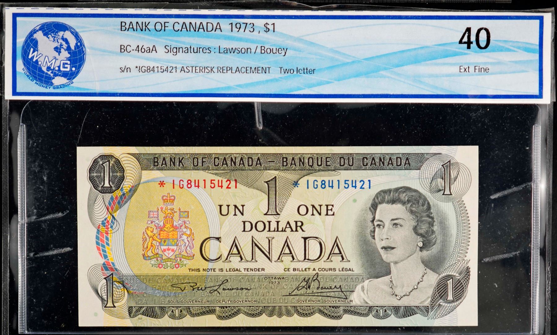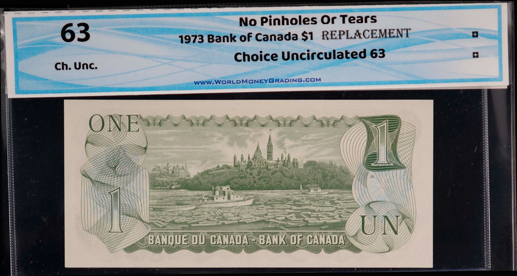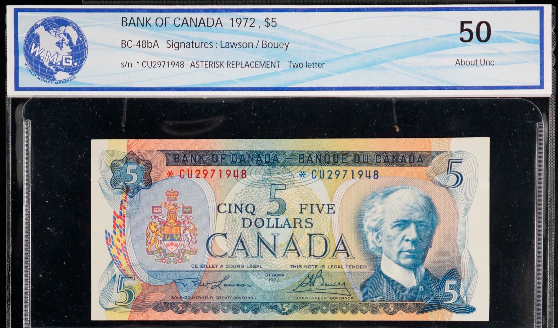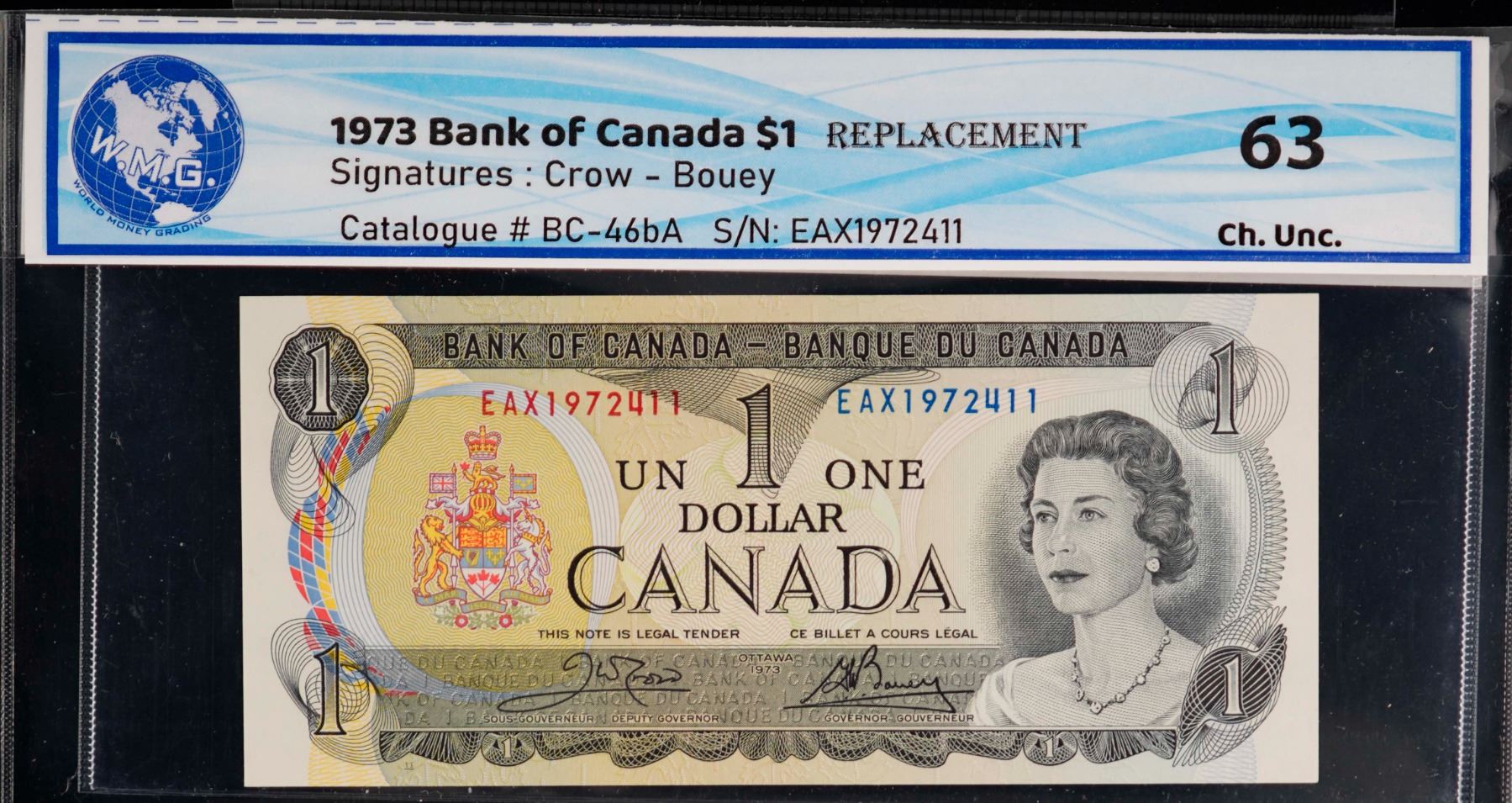 1972 $5 BC-48bA #*CU2971948, 1973 $1 BC-46aA #*IG8415421 & BC-46bA #EAX1972411. Lot of 3 replacement notes AU to UNC conditions. All 3 notes WMG Graded.