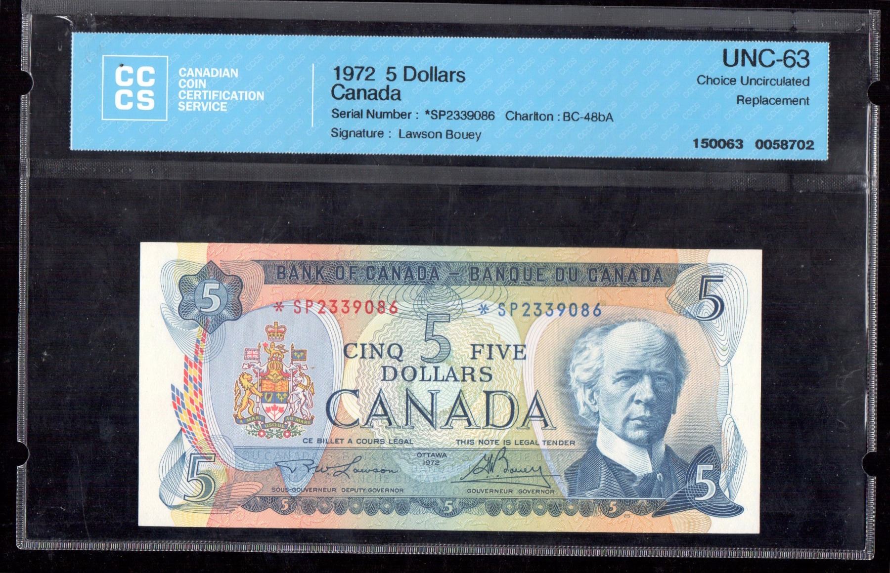 Lot 29 1972 $5 Bank of Canada CCCS UNC-63 Lawson-Bouey Ch BC-48bA