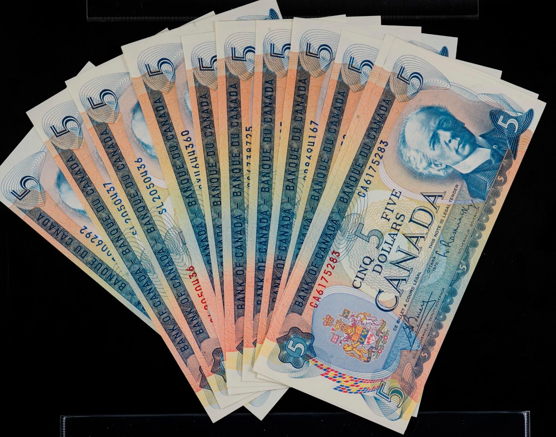 1972 $5 Lot; Includes various signatures & prefix. Some better ones. AU to Gem Unc. Lot of 11 notes.