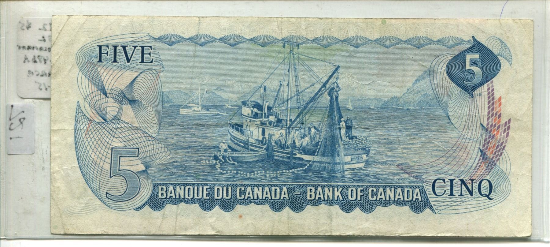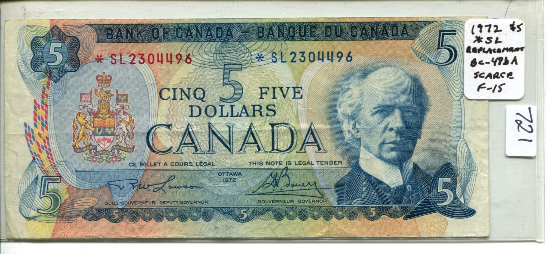 1972 $5 *SL Replacement. Lawson-Bouey signatures. BC-48bA. F-15. Scarce.