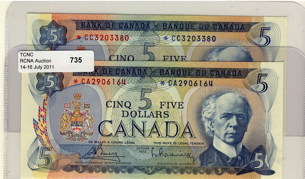 1972 $5 bc-48Aa #*CA2906164 Choice UNC & *CC3203380 EF/AU. Lot of 2 notes.