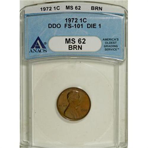<B>1972/72 1C Doubled Die MS62 Brown ANACS.</B></I> FS-101, Die 1. NGC Census: (14/260). PCGS Population (10/309). Mintage: 75,000. Numismedia Wsl. Price for NGC/PCGS coin in MS62: $340. (#2949)<BR><BR><b>Shipping:</b> Coins & Currency (<a target="_blank" href="http://www.heritageauctions.com/common/shipping.php">view shipping information</a>)