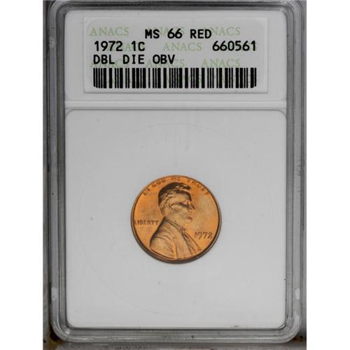 <B>1972/72<1C> Doubled Die MS66 Red ANACS.</B></I> A lustrous orange-red Gem with gorgeous preservation and exceptional eye appeal. A few small carbon flecks are detected mostly on the obverse. <BR><BR><B>Important notice:</B> Heritage usually auctions material at the rate of 200-250 lots per hour. On some occasions eBay Live bid software or the Internet may not be able to keep up with the pace of the auction. We recommend placing a realistic absentee bid now as insurance to avoid disappointment. Occasionally the auctioneer may eliminate or reject an eBay Live bid, and the auctioneer may also reopen a lot after the close of the eBay live bidding (usually because we missed an audience bid), and may reject your bid even if it shows you as the winning bidder. By bidding via eBay Live, you agree that Heritage may award the lot to another bidder at its sole discretion under the circumstances described above or any other reasonable circumstances. Since eBay bids are not shown to us until we open the lot on the floor, we treat those bids just like floor bids. In most cases the floor responds before the eBay bid is presented to us, due to Internet lag time, so for consistency we have made it a policy that floor bids are always considered first over tie eBay live bids. Also please note that all Heritage lots purchased through eBay Live carry a 20% Buyer's Premium. Please make sure you read the Terms and Conditions before you bid. This lot is being auctioned in conjunction with a live floor auction by Heritage Galleries & Auctioneers. All final auction and invoice information will be supplied by Heritage Galleries & Auctioneers, and all other information should be considered preliminary. Lot:689 <BR><BR><B>Winning Notification and Billing:</B> After the FINAL session in this auction is complete, Heritage will send e-mail and snail mail invoices. This process normally takes several days. All final auction and invoice information will be supplied by Heritage Galleries & Auctioneers, and all other information should be considered preliminary. <BR><BR>This auction will be conducted on a live auction floor and over the Internet through eBay Live. If you choose to place an absentee bid, please take a moment to <font color='#0000ff'><u><a href='http://pages.ebay.com/liveauctions/help/before/laabsentee.html'>learn how eBay Live absentee bidding works</a></u></font><font color='#000000'>