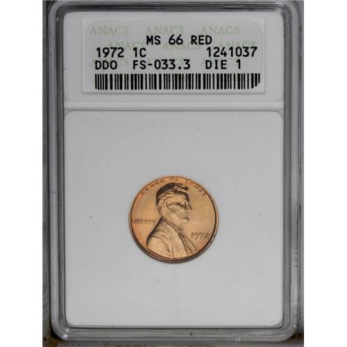 <B>1972/72<1C> Doubled Die MS66 Red ANACS.</B></I> FS-033.3. Die #1. A magnificent Gem with radiant golden-red color and potent cartwheel luster. Boldly struck and nearly carbon-free. <BR><BR><B>Important notice:</B> Heritage usually auctions material at the rate of 200-250 lots per hour. On some occasions eBay Live bid software or the Internet may not be able to keep up with the pace of the auction. We recommend placing a realistic absentee bid now as insurance to avoid disappointment. Occasionally the auctioneer may eliminate or reject an eBay Live bid, and the auctioneer may also reopen a lot after the close of the eBay live bidding (usually because we missed an audience bid), and may reject your bid even if it shows you as the winning bidder. By bidding via eBay Live, you agree that Heritage may award the lot to another bidder at its sole discretion under the circumstances described above or any other reasonable circumstances. Since eBay bids are not shown to us until we open the lot on the floor, we treat those bids just like floor bids. In most cases the floor responds before the eBay bid is presented to us, due to Internet lag time, so for consistency we have made it a policy that floor bids are always considered first over tie eBay live bids. Also please note that all Heritage lots purchased through eBay Live carry a 20% Buyer's Premium. Please make sure you read the Terms and Conditions before you bid. This lot is being auctioned in conjunction with a live floor auction by Heritage Galleries & Auctioneers. All final auction and invoice information will be supplied by Heritage Galleries & Auctioneers, and all other information should be considered preliminary. Lot:690 <BR><BR><B>Winning Notification and Billing:</B> After the FINAL session in this auction is complete, Heritage will send e-mail and snail mail invoices. This process normally takes several days. All final auction and invoice information will be supplied by Heritage Galleries & Auctioneers, and all other information should be considered preliminary. <BR><BR>This auction will be conducted on a live auction floor and over the Internet through eBay Live. If you choose to place an absentee bid, please take a moment to <font color='#0000ff'><u><a href='http://pages.ebay.com/liveauctions/help/before/laabsentee.html'>learn how eBay Live absentee bidding works</a></u></font><font color='#000000'>
