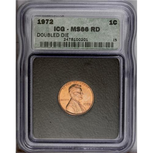 <B>1972/72<1C> Doubled Die Obverse MS66 Red ICG.</B></I> FS-033.3 Die 1. A solidly struck example of this popular Lincoln cent doubled die. Original copper-red color dominates the surfaces.