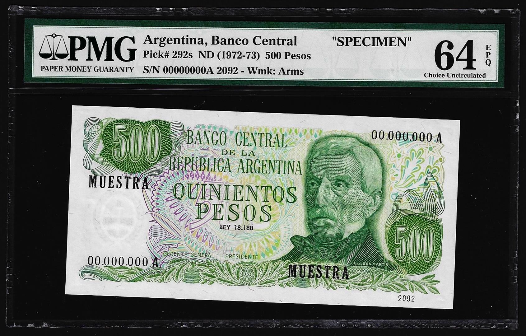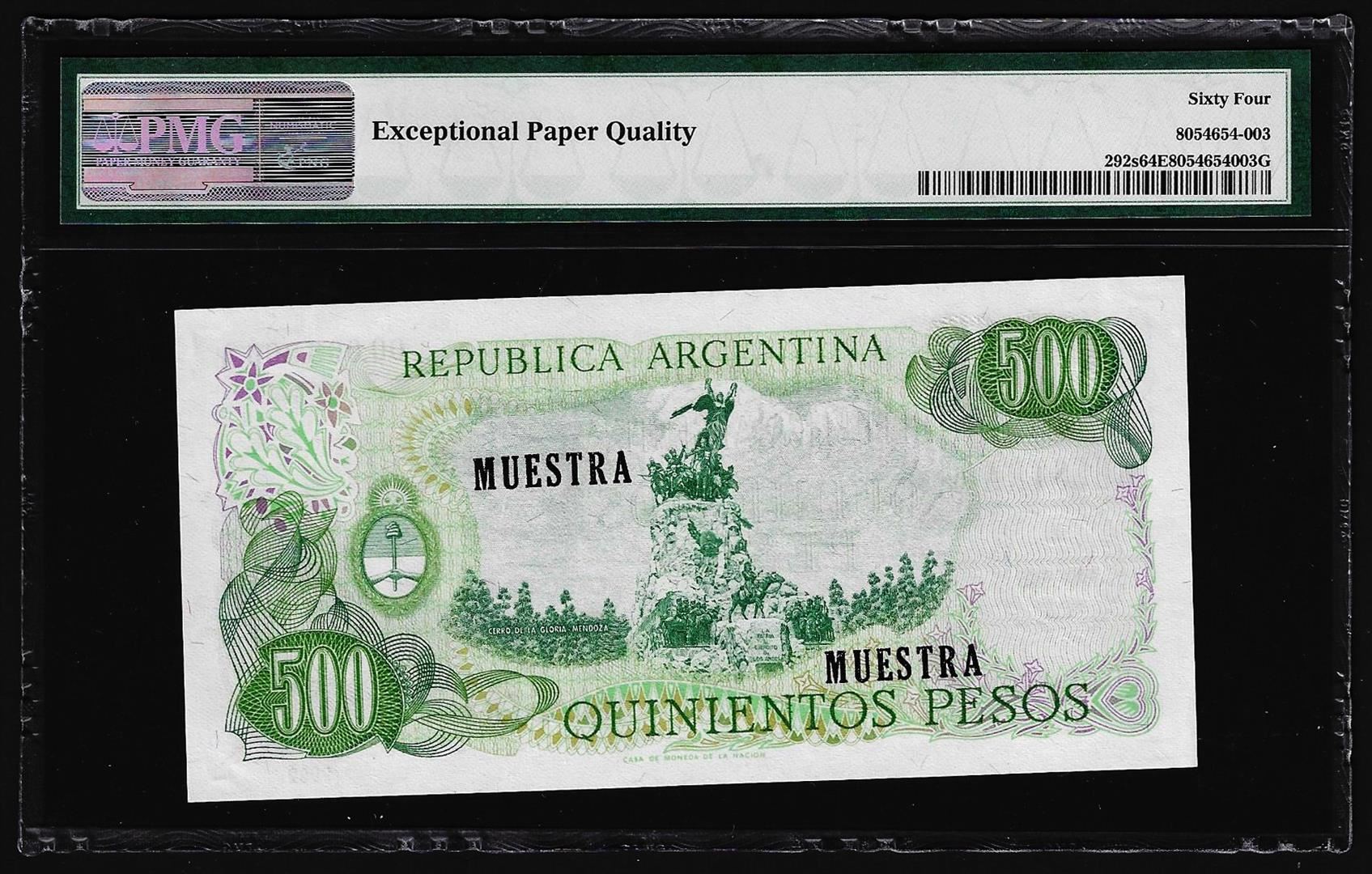 One 1972-73 Argentina 500 Pesos Banco Central Specimen Note PMG Choice Uncirculated 64EPQ. PMG Certified.