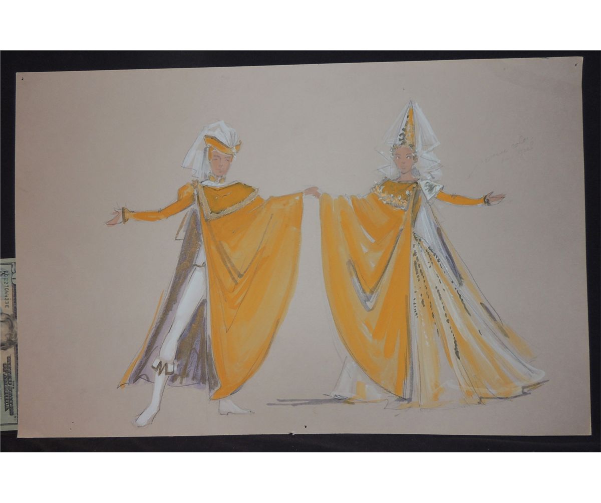 This one is of two gorgeous matching male and female ballroom wardrobes for the Sleeping Beauty stage shows. It has notes by the artist, and some sketching on the back side. This is the only artwork that shows 2 full sketches.