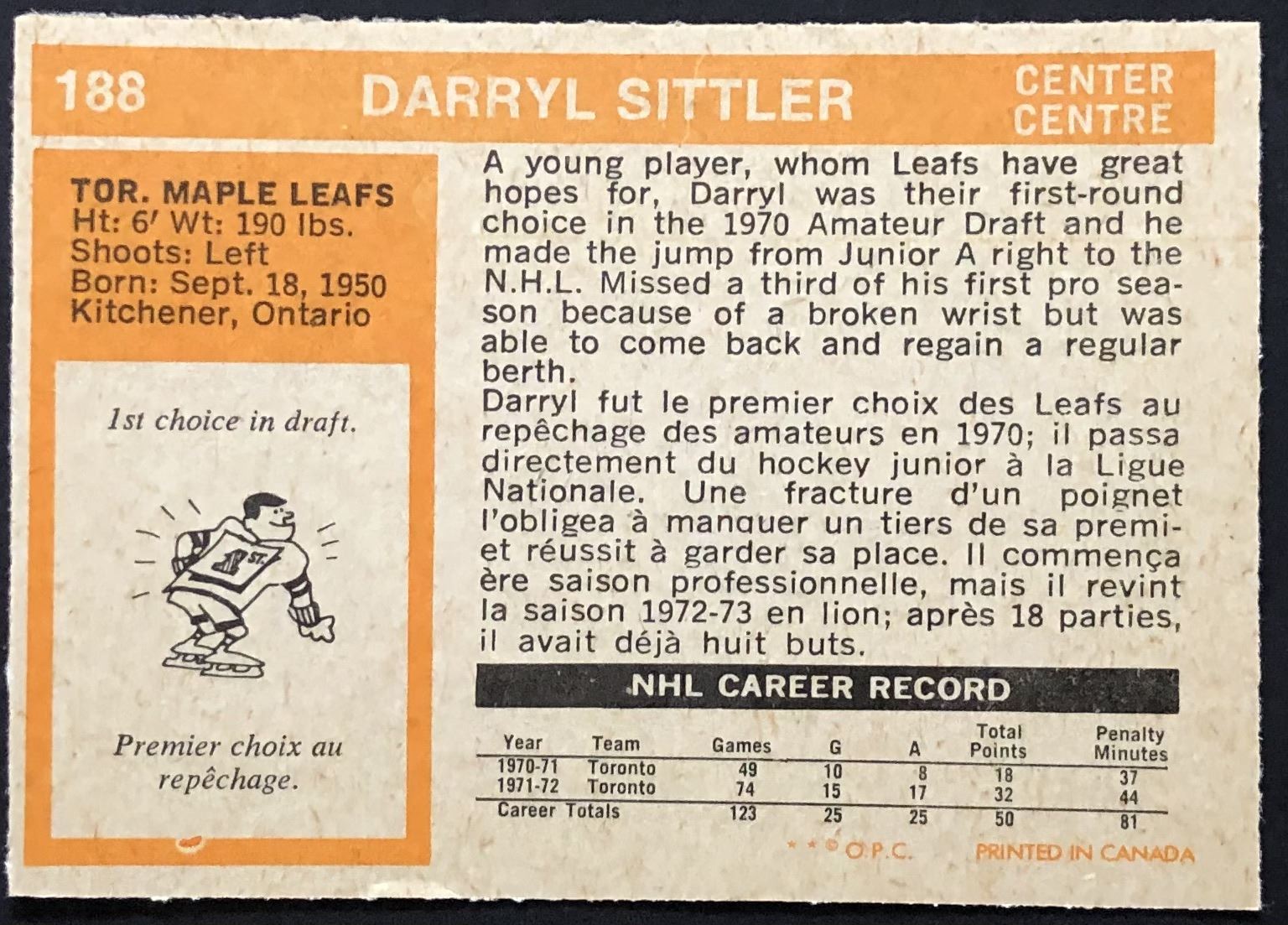 Card #188 NHL, hockey, vintage, hall of fame, OPC