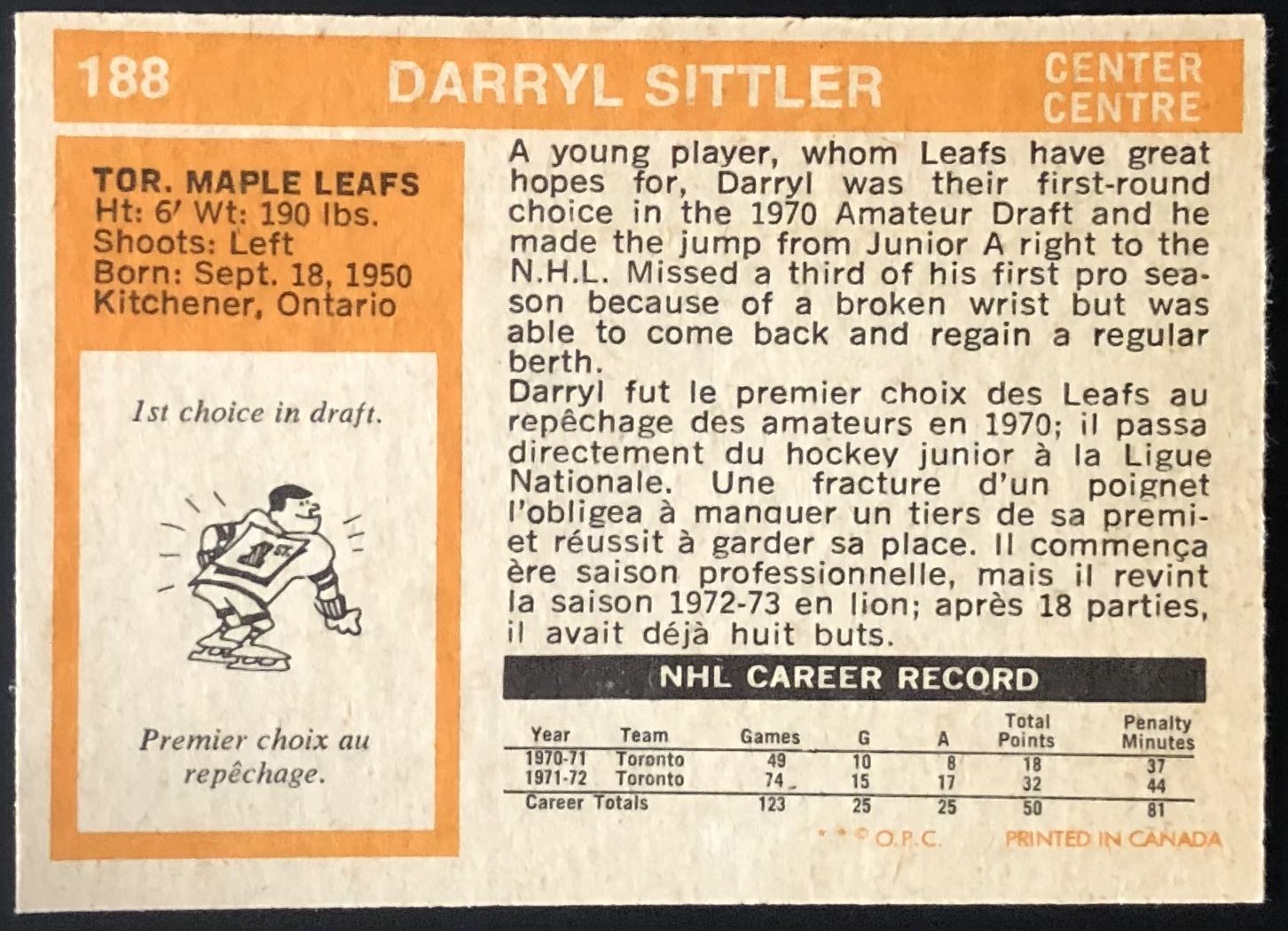 Card #188 NHL, hockey, vintage, OPC, hall of fame