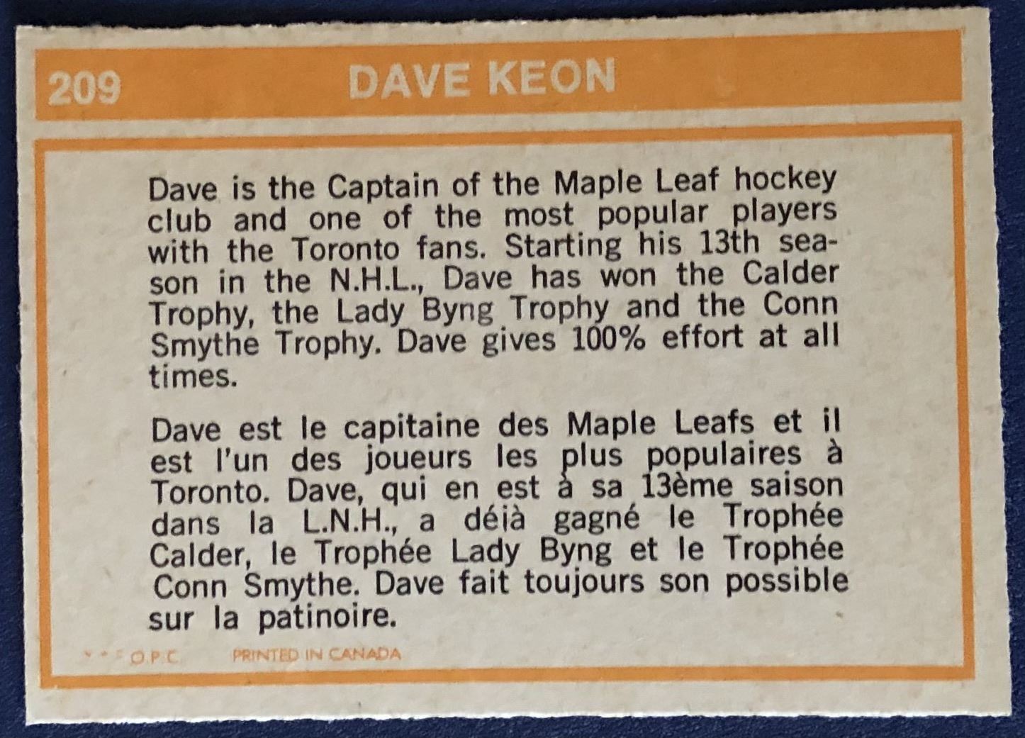 Card #209 vintage, hall of fame, hockey, NHL, OPC