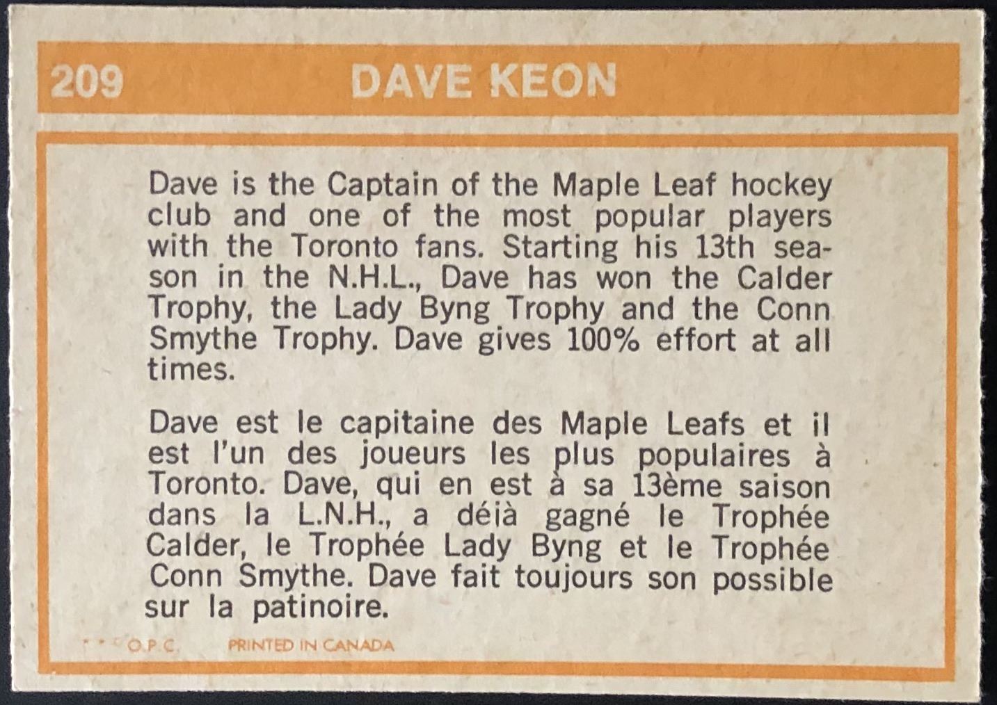 Card #209 NHL, hockey, vintage, OPC, hall of fame