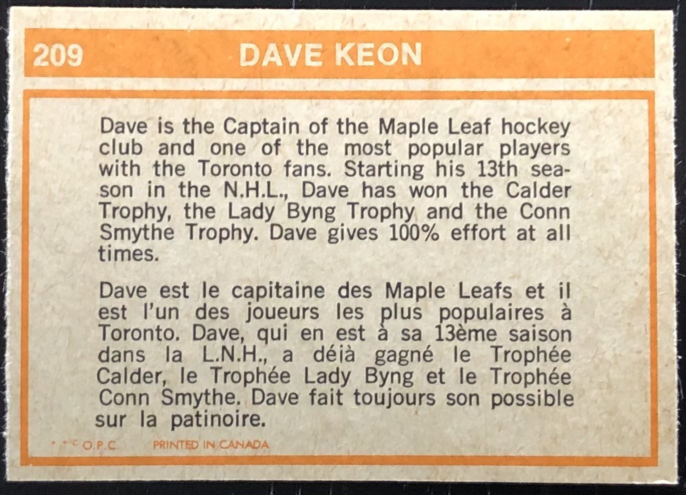 Card #209 NHL, hockey, vintage, OPC, hall of fame