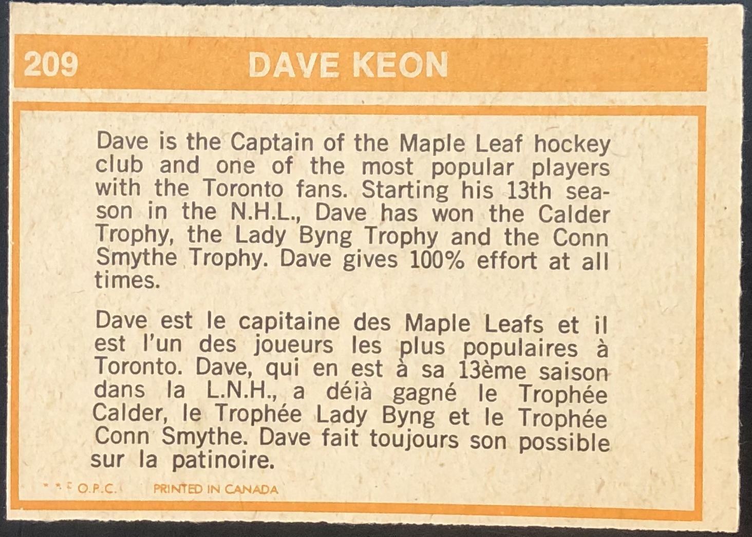 Card #209 hockey, NHL, vintage, OPC, hall of fame