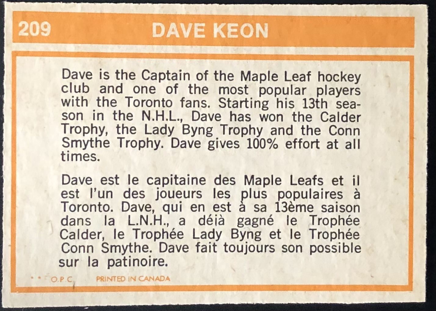Card #209 hockey, NHL, vintage, OPC, hall of fame