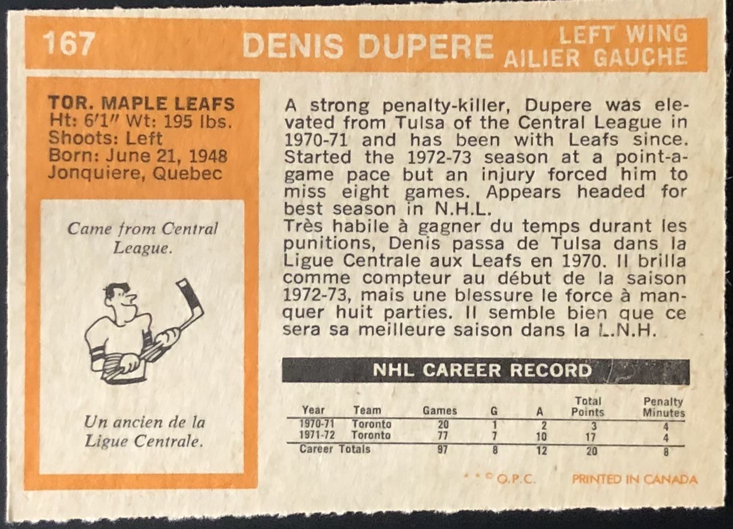 Card #167 NHL, hockey, vintage, OPC, rookie