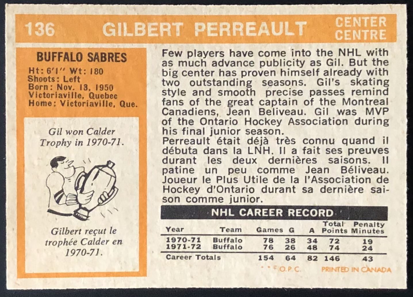 Card #136 NHL, hockey, vintage, OPC, hall of fame