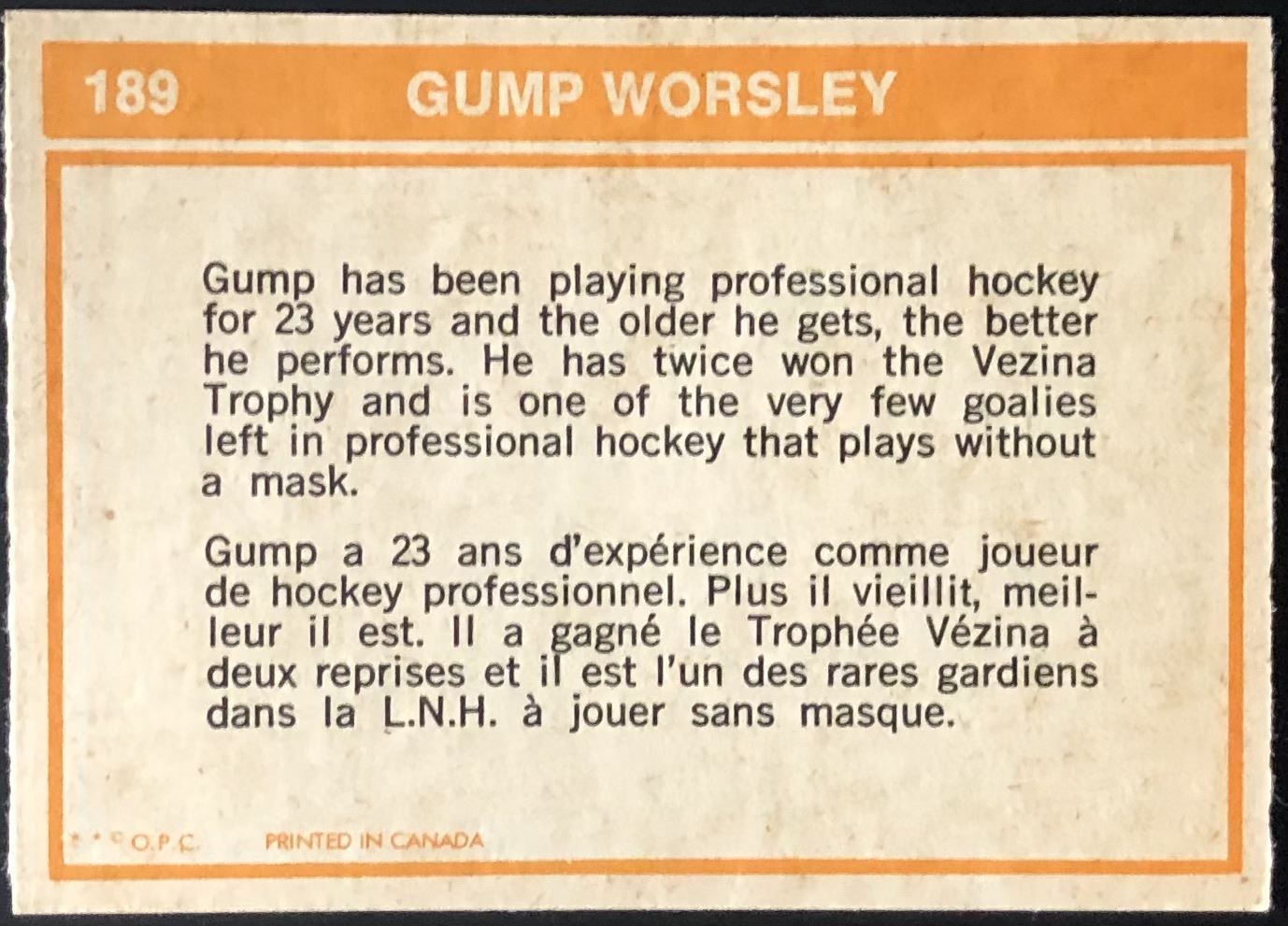 Card #189 NHL, hockey, vintage, OPC, hall of fame