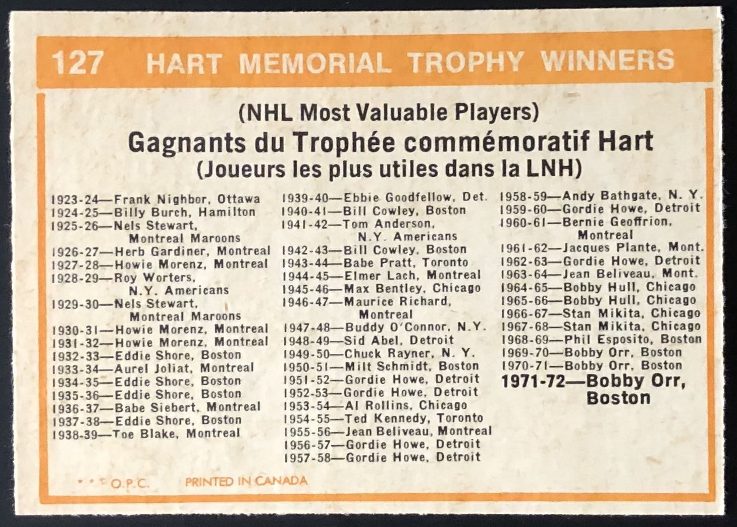 Card #127 NHL, hockey, vintage, OPC