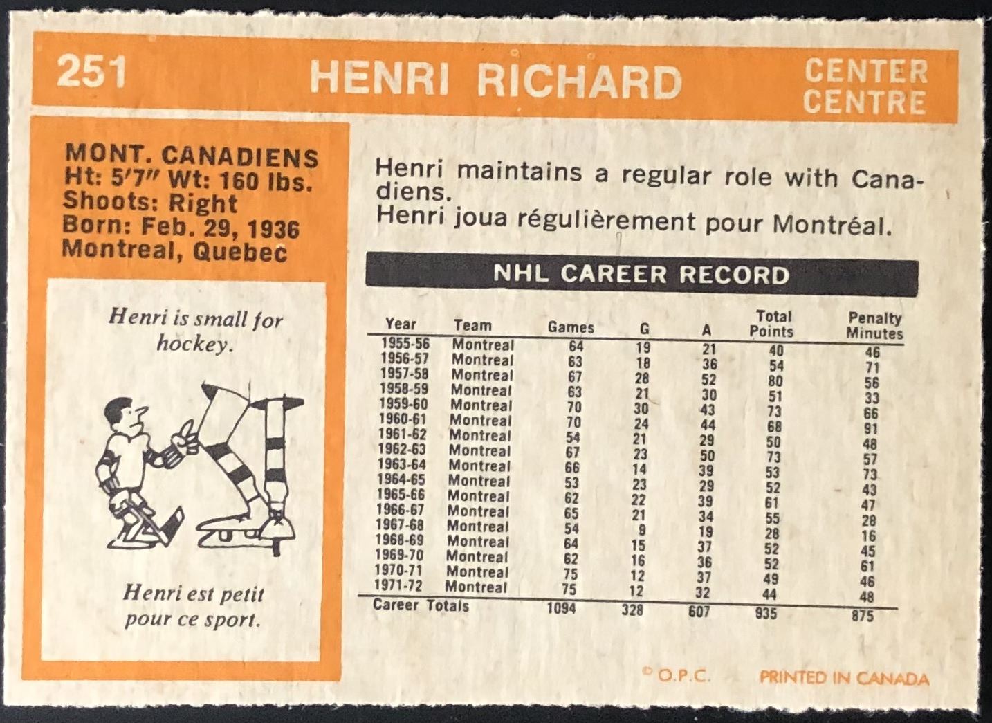 Card #251 NHL, hockey, vintage, OPC, hall of fame
