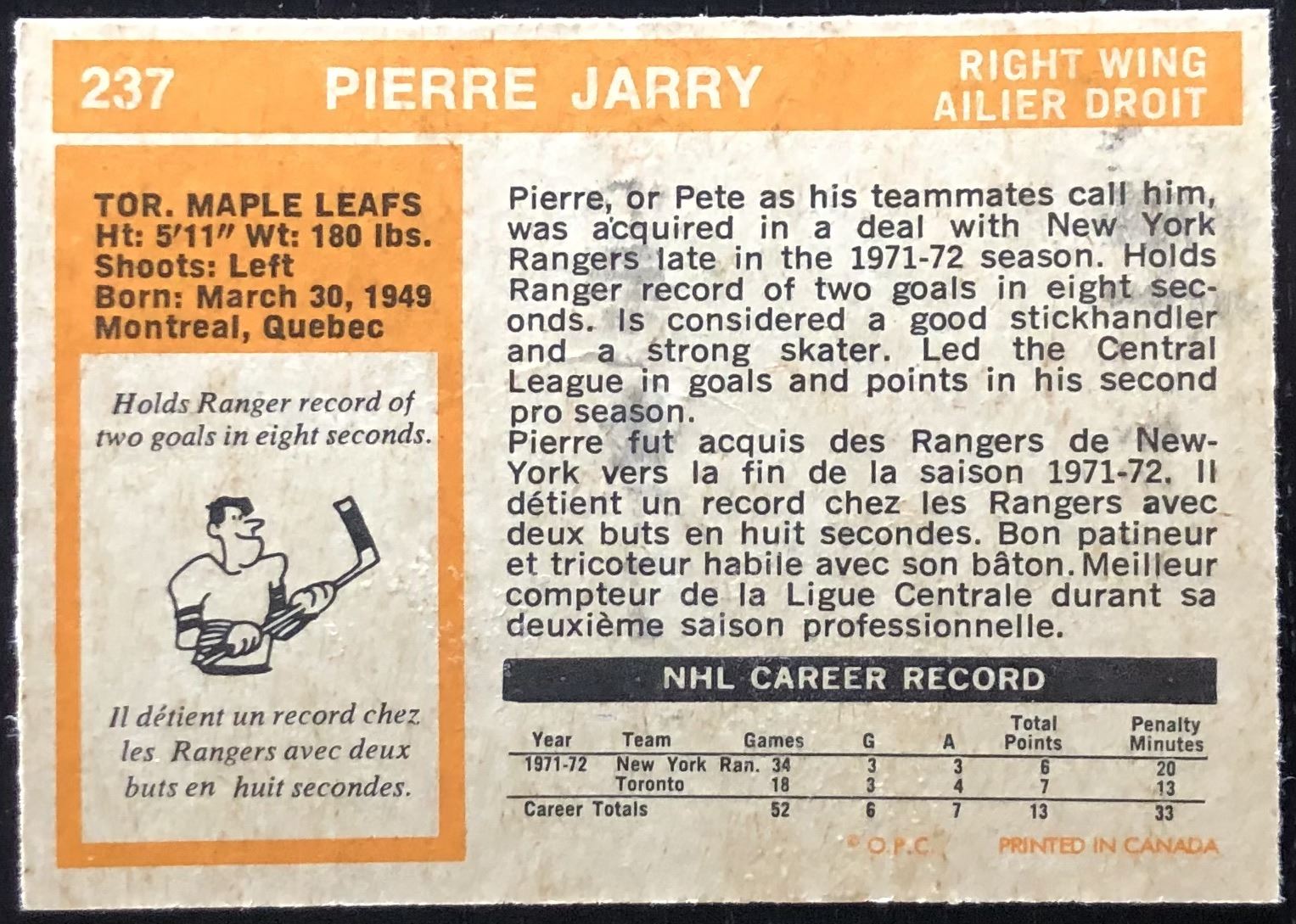 Card #237 NHL, hockey, vintage, OPC, rookie