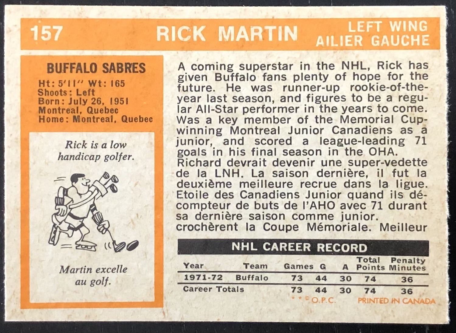 Card #157 NHL, hockey, vintage, hall of fame, OPC