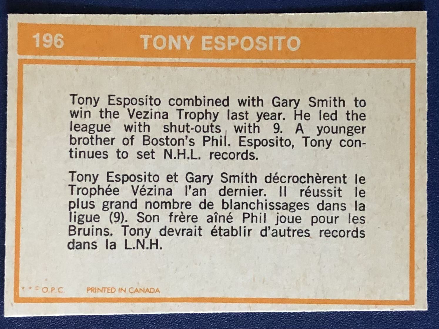 Card #196 vintage, hall of fame, hockey, NHL, OPC