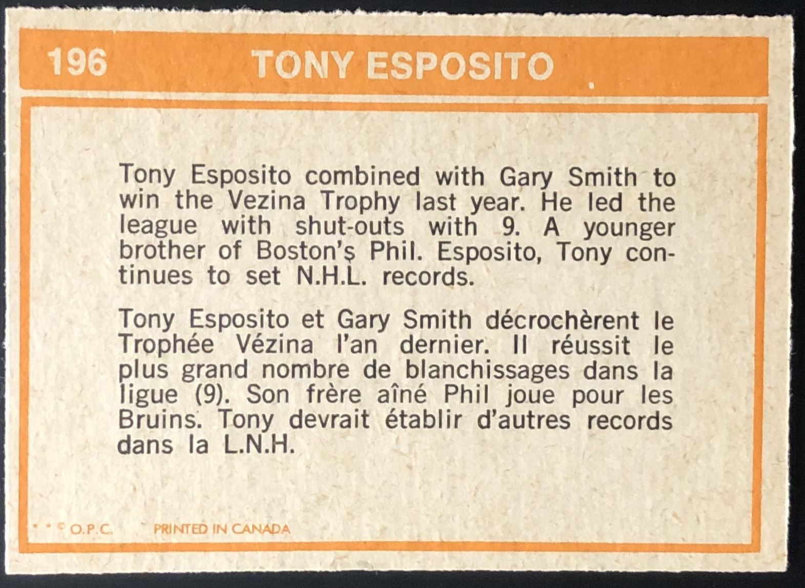 Card #196 NHL, hockey, vintage, OPC, hall of fame