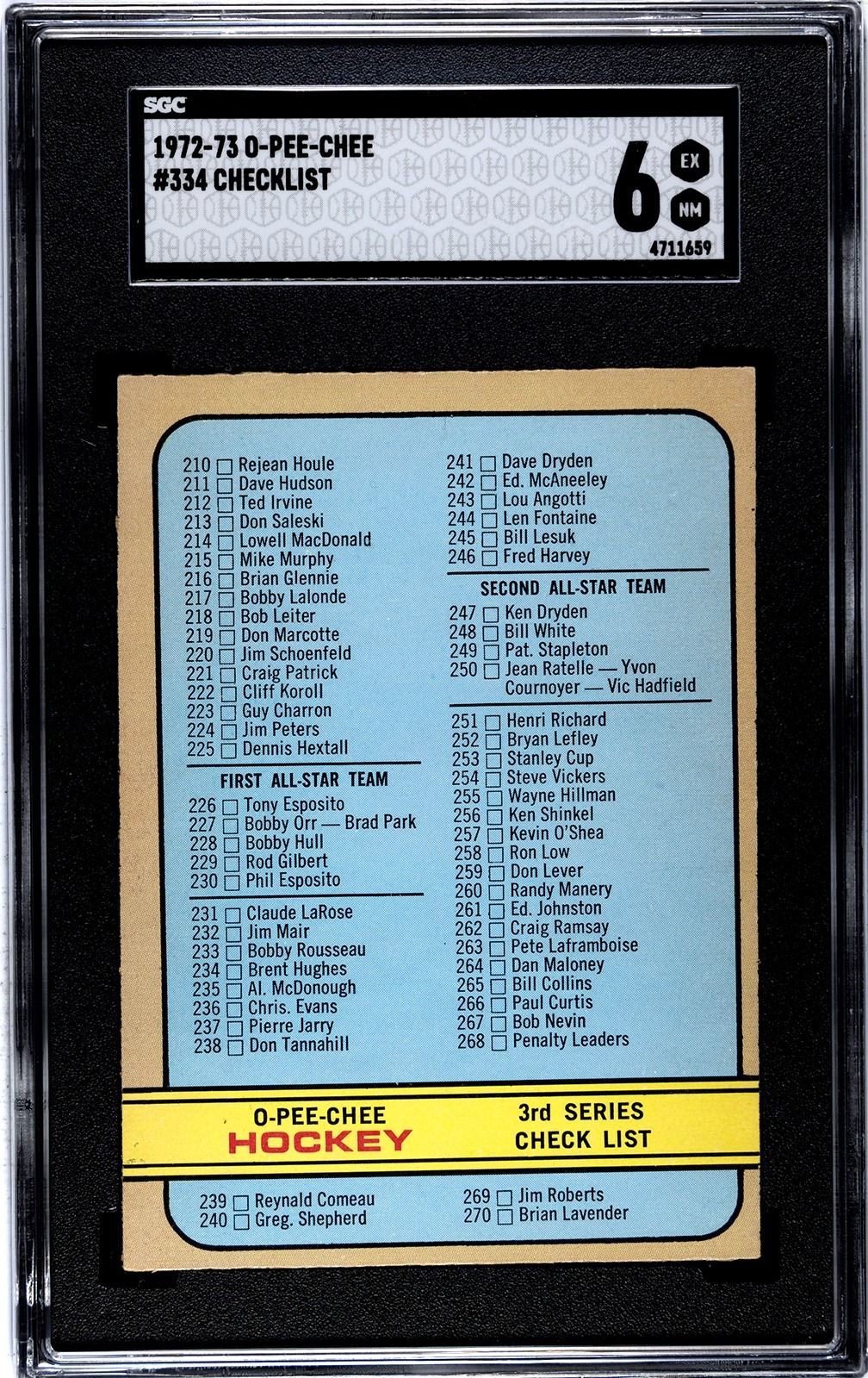 Unmarked vintage checklists remain some of the best "demand" cards in the hobby, mainly because back in those days people actually marked them up when they acquired cards. Clean ones are always needed by set builders. Here's a nice higher grade unmarked 3rd Series checklist from the popular 1972-73 O-Pee-Chee set. Graded 6 EX-NM by SGC.
