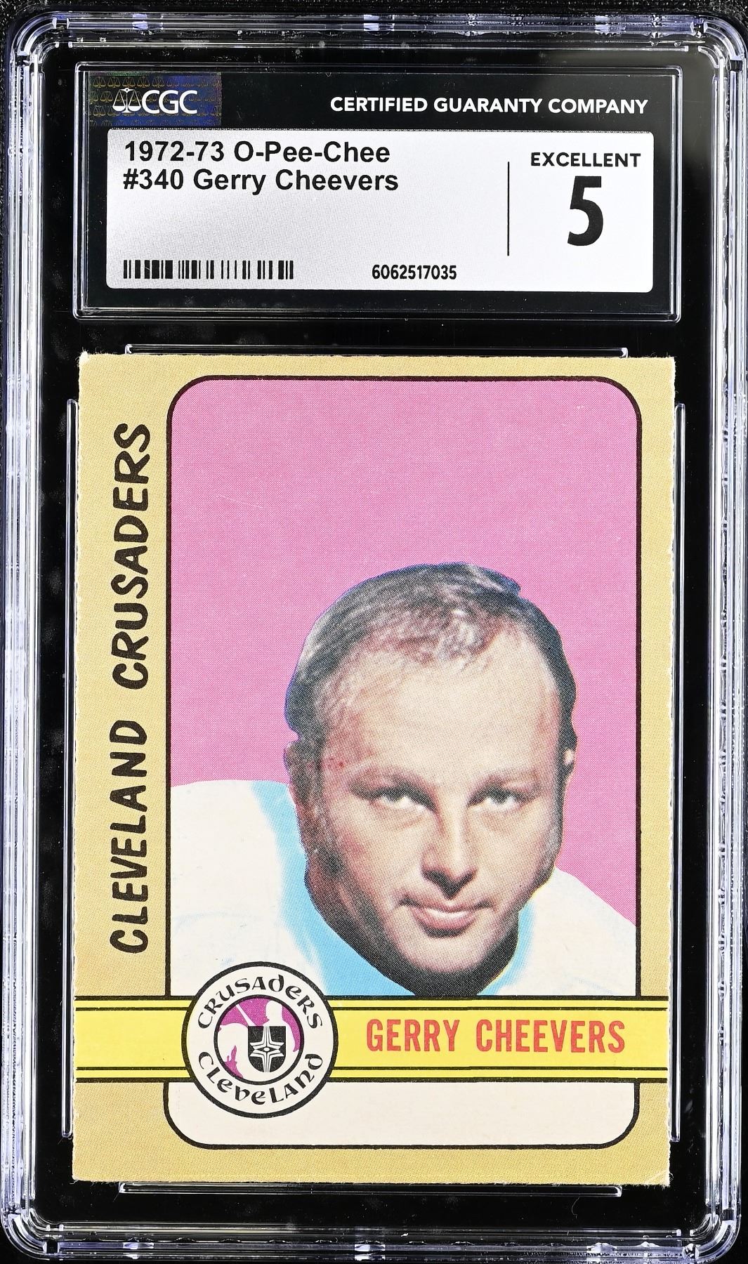 HOFer Gerry Cheevers had jumped to the WHA after winning a pair of Stanley Cups, this is part of that high number run which featured the first cards of WHA players. Graded 5 EX by CGC.