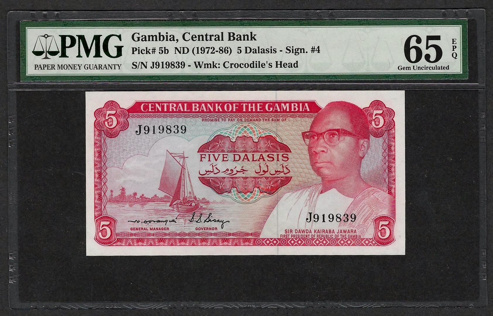 One 1972-86 Central Bank Gambia 5 Dalasis Note Pick# 5b PMG Gem Uncirculated 65EPQ. PMG Certified.