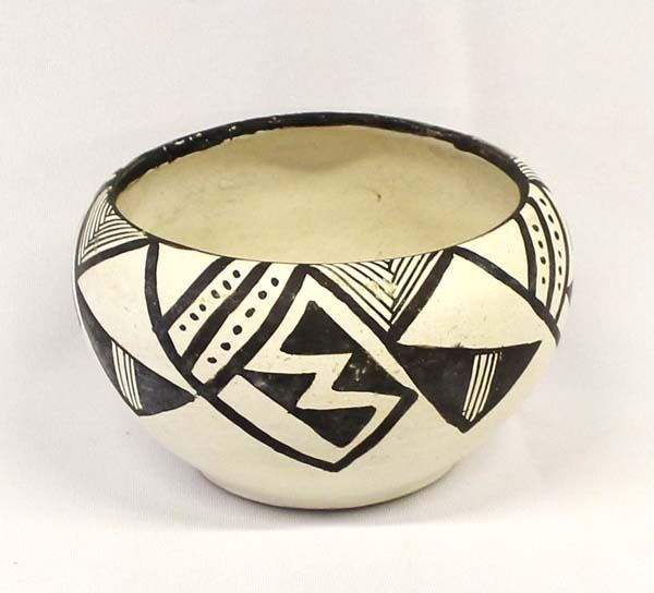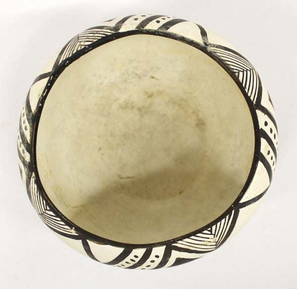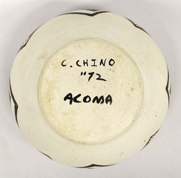 1972 Native American Acoma Pottery Bowl by C. Chino (1925-2012), measures 3''H x 5''D and is signed on the bottom, FYI: ''Carrie Chino Charlie made her home on the Pueblo and her life-long pleasure was caring for her family and making exquisite pottery. Carrie started making pottery in the 1940s and is best known for her traditional and contemporary polychrome, black-on-white fineline, whiteware jars and bowls.''