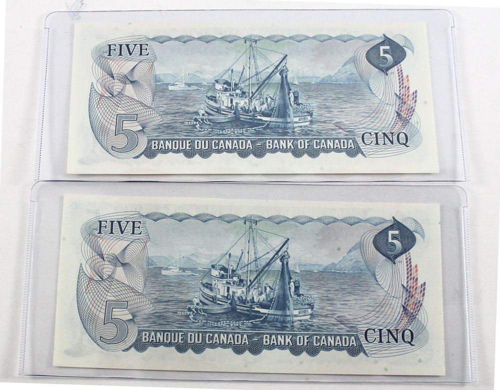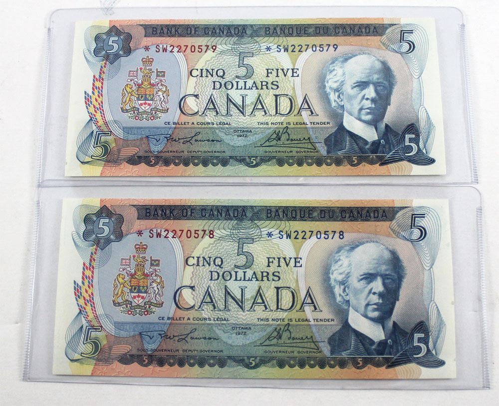 1972 Bank of Canada $5 *SW Replacement Notes in Gem Uncirculated Condition. This unique sequential pair of replacement notes is a rare find. Lot includes *SW2270578/*SW2270579.