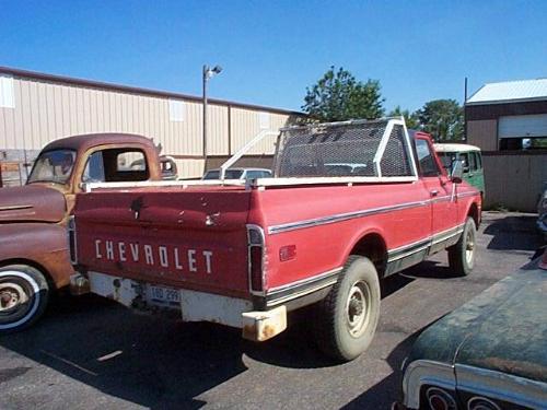 1972 CHEVROLET C20 TON PICKUP, 4X4, RED AND WHITE, RUNS AND DRIVES, INTERIOR NOT ORIGINAL AND IN ROUGH SHAPE. ORIGINAL DOOR PANELS-WHITE, WESTERN DESIGN, STICKSHIFT, CE141J617089, RUST IN THE ROCKERS AND IN BOX., SOUTH DAKOTA FARM TRUCK- RANCH, 350 MOTOR
