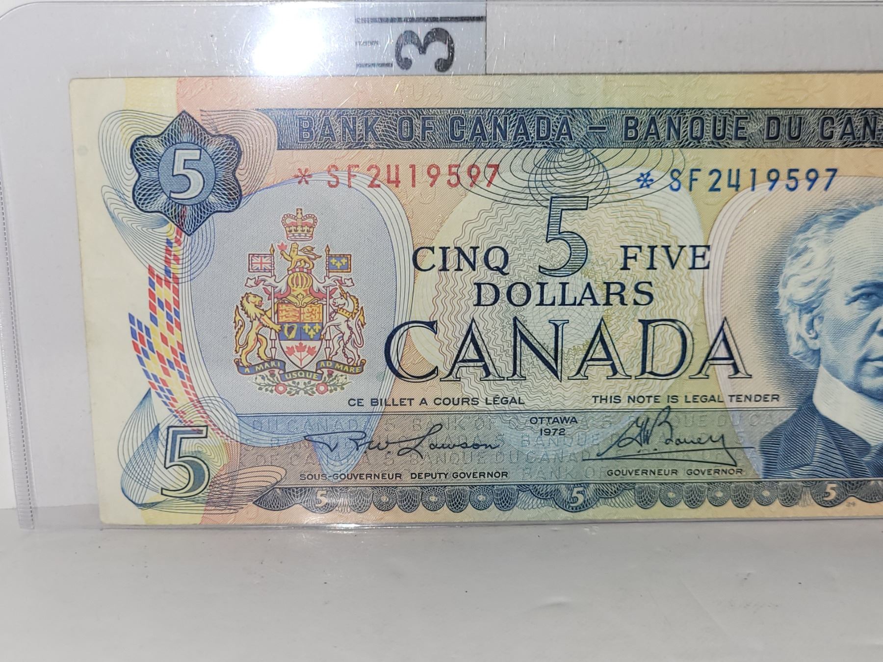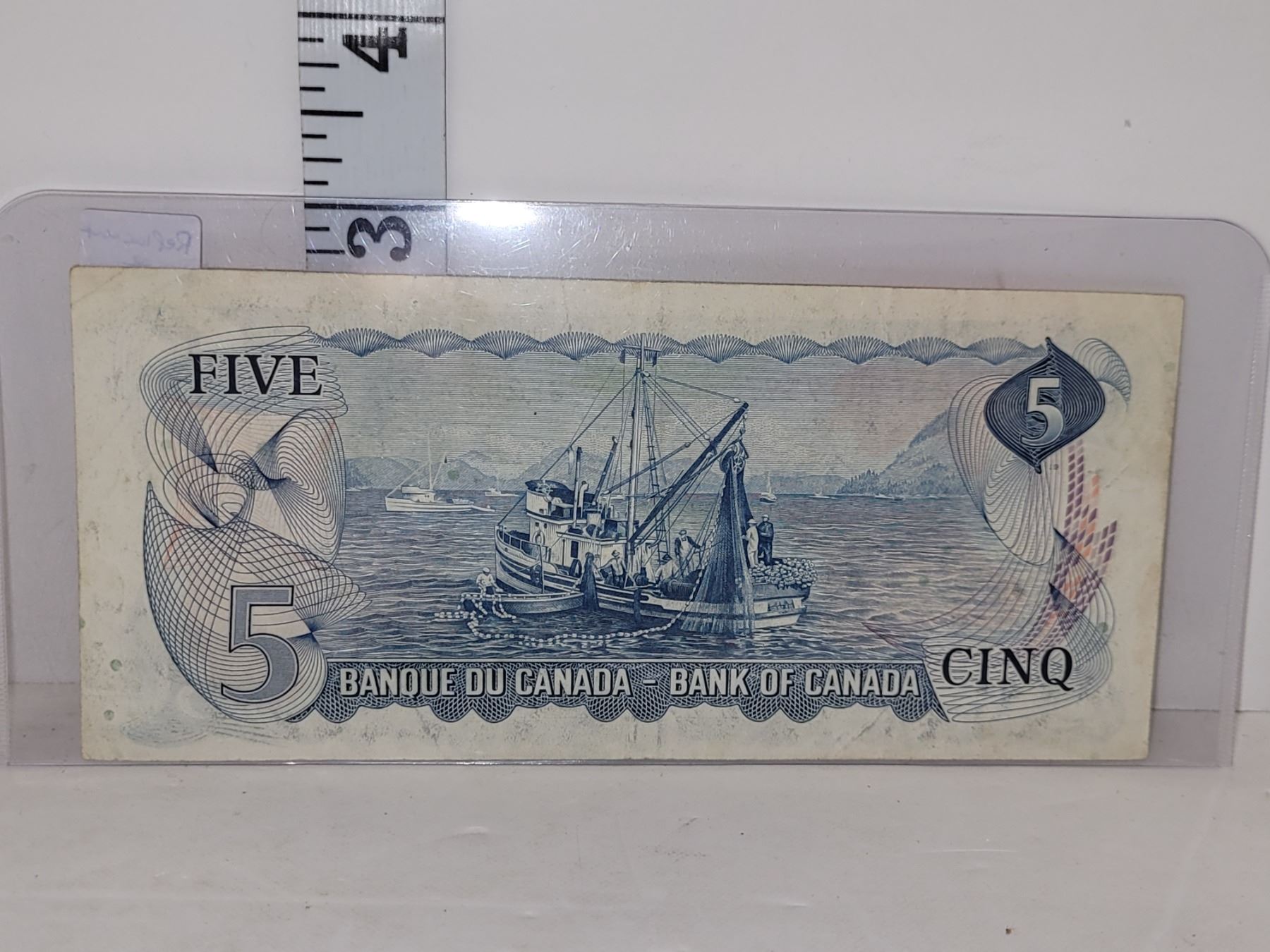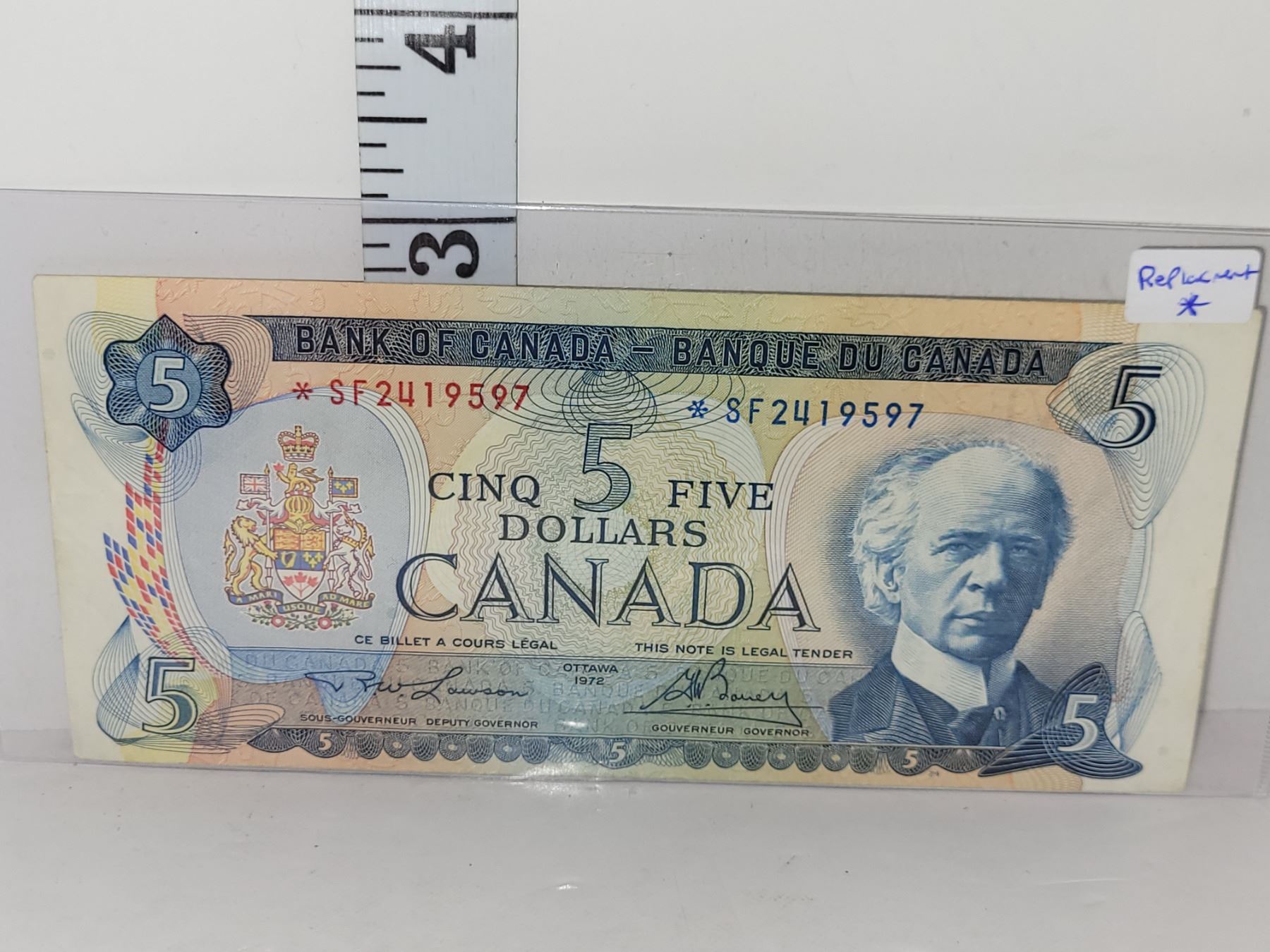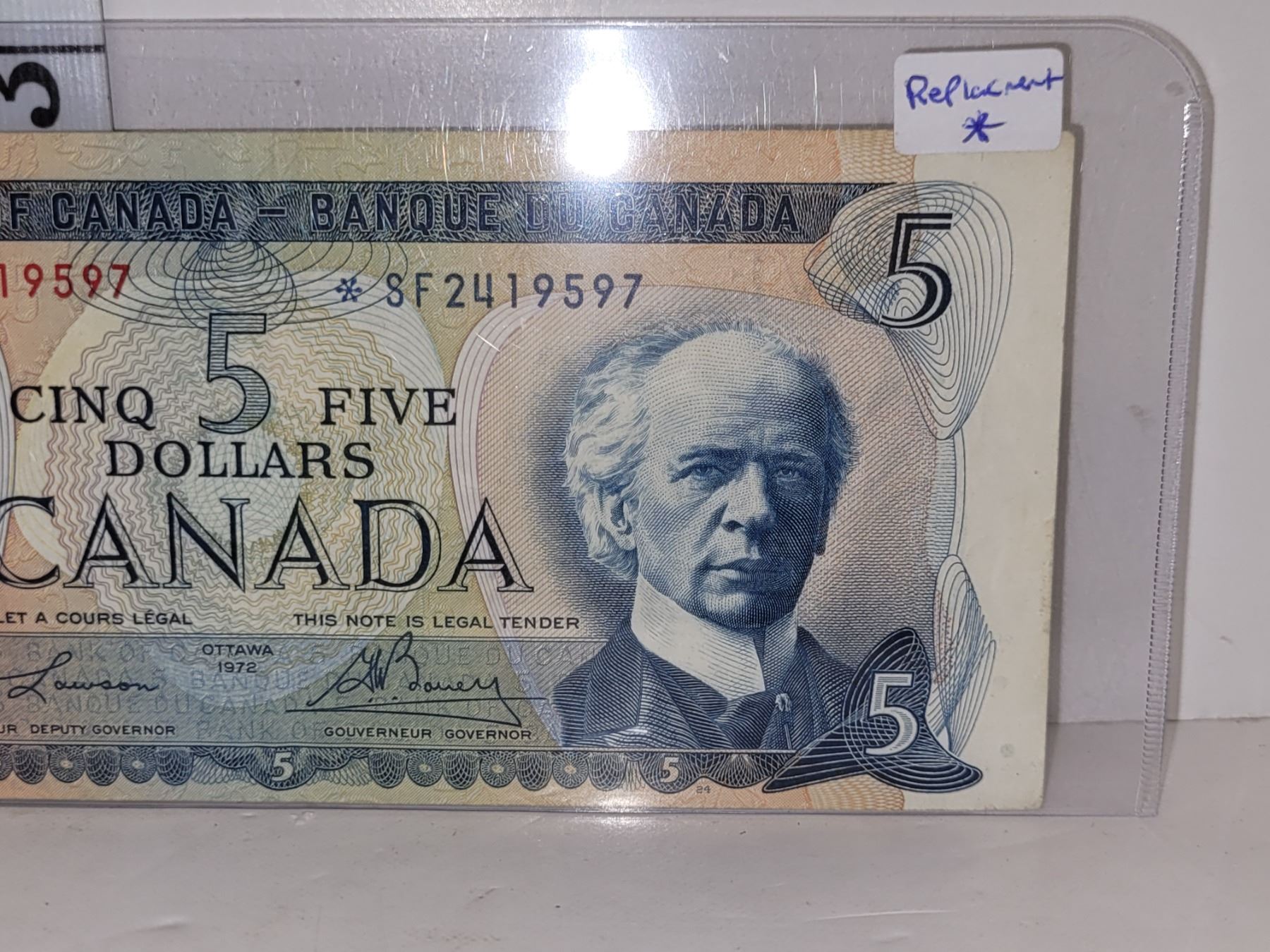 1972 Canada $5 Bill Error (miscut) + Replacement Bill