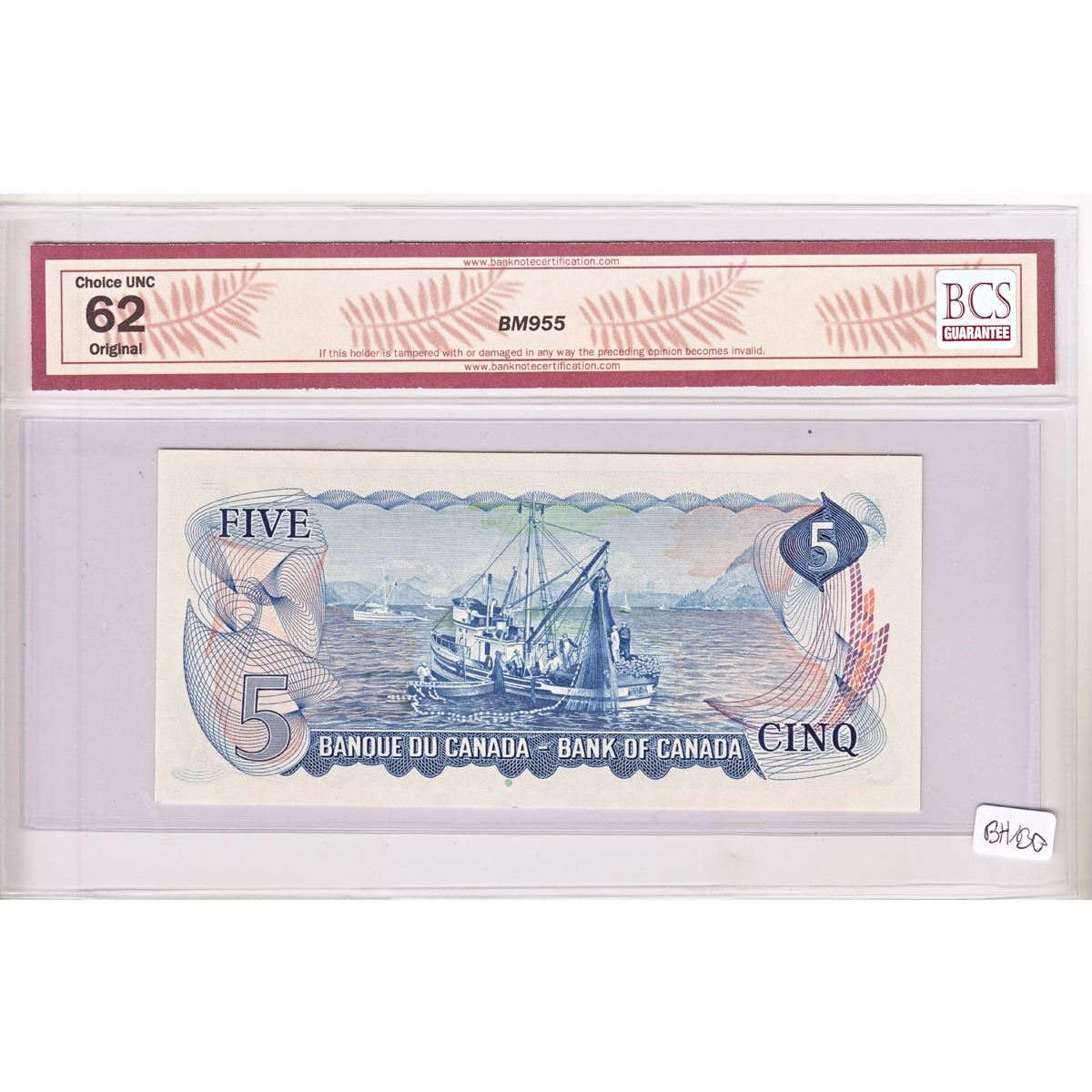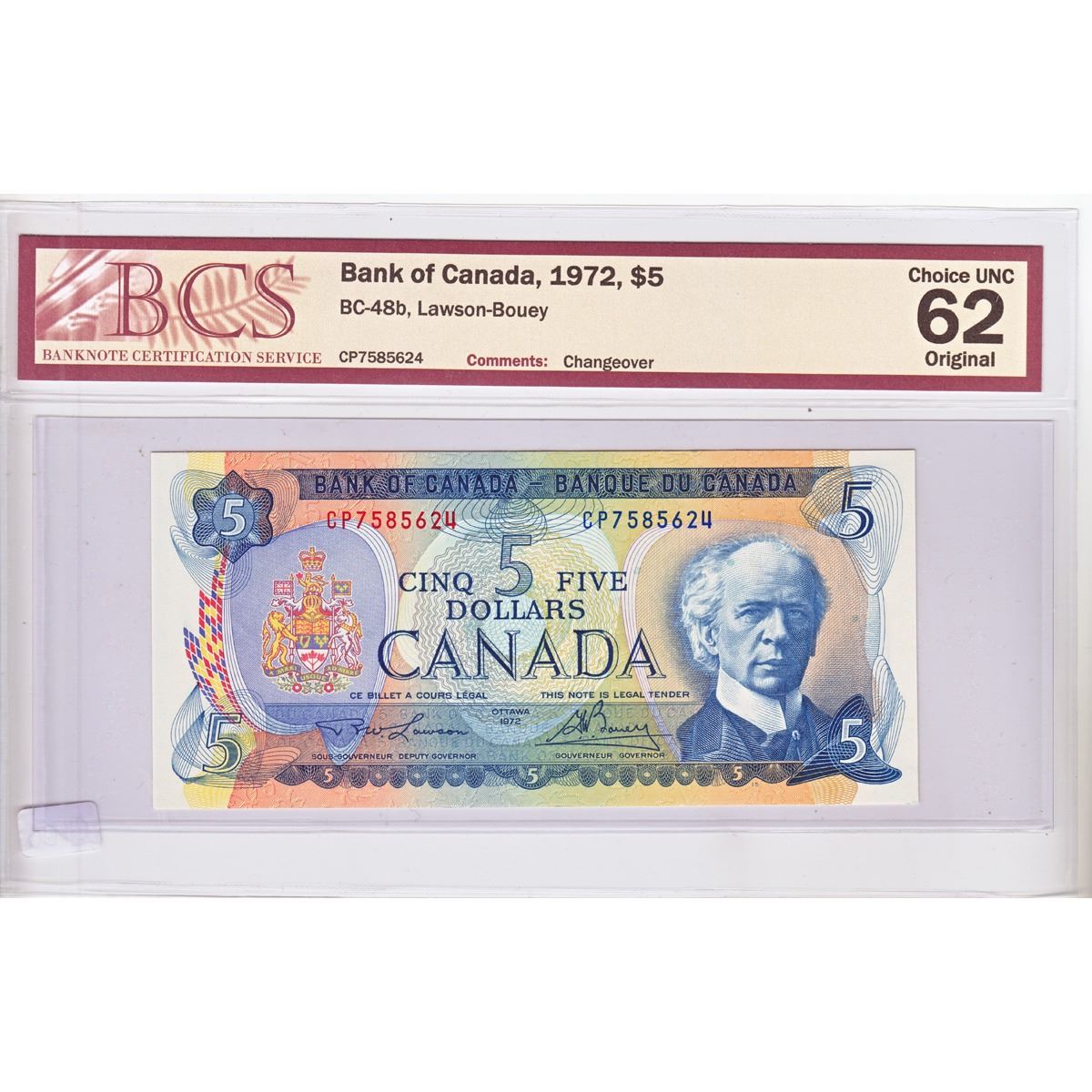 1972 Changeover $5.00 Note from the Bank of Canada; cat code BC-48b, Lawson-Bouey signatures, Prefix CP, BCS Certified CUNC-62, Original. The prefix CP was used to help bridge the transition between the Bouey-Rasminsky and Lawson-Bouey Signature Combinations; this being the latter of the two. Buyers Premium will be added on all items as per our terms of sale. We accept Paypal, Credit Card, E-Transfer Payments, Cheque or Money Orders (there is an additional 3% fee for using Paypal or Credit Card). All invoices will be emailed immediately following the auction, please contact us if you would like to pay by credit card or receive a new revised lower total for mailing in payment or sending an e-transfer (3% discount). All Items Are Sold "AS IS", no returns