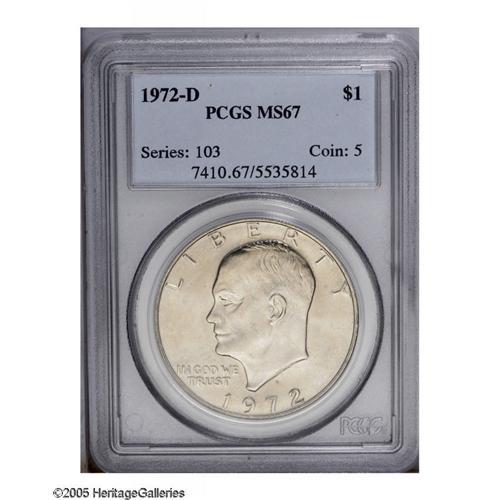 <B>1972-D<$1> MS67 PCGS.</B></I> Radiantly lustrous surfaces display just a whisper of light tan color. All of the design elements are sharply struck throughout, and both sides are impeccably preserved. Population: 4 in 67, 0 finer (12/05).